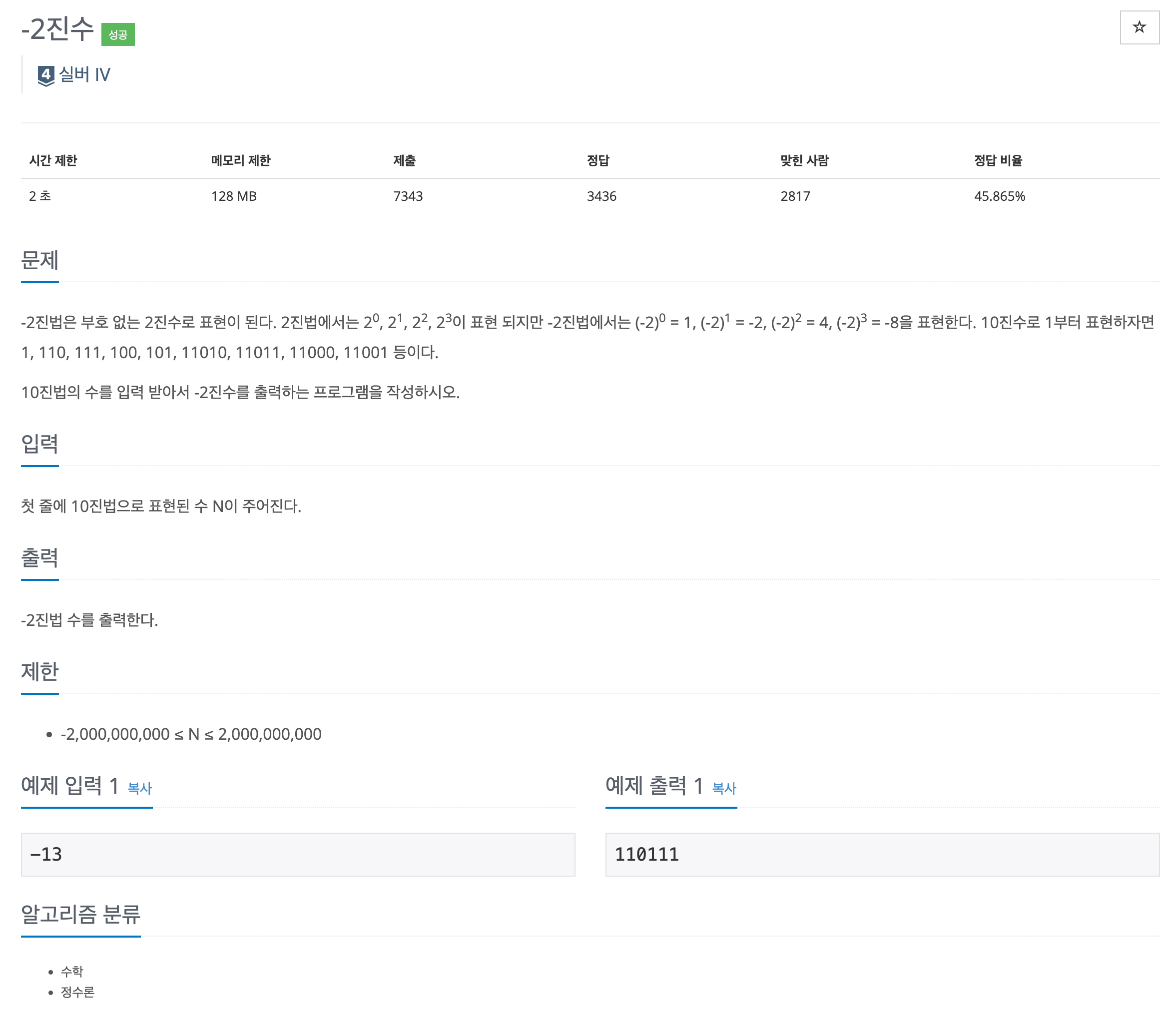 -2진법은 부호 없는 2진수로 표현이 된다. 2진법에서는 20, 21, 22, 23이 표현 되지만 -2진법에서는 (-2)0 = 1, (-2)1 = -2, (-2)2 = 4, (-2)3 = -8을 표현한다. 10진수로 1부터 표현하자면 1, 110, 111, 100, 101, 11010, 110