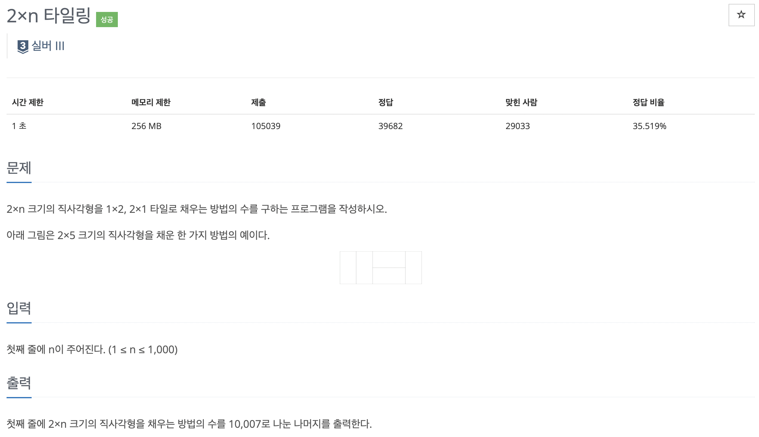 2×n 크기의 직사각형을 1×2, 2×1 타일로 채우는 방법의 수를 구하는 프로그램을 작성하시오. 아래 그림은 2×5 크기의 직사각형을 채운 한 가지 방법의 예이다.