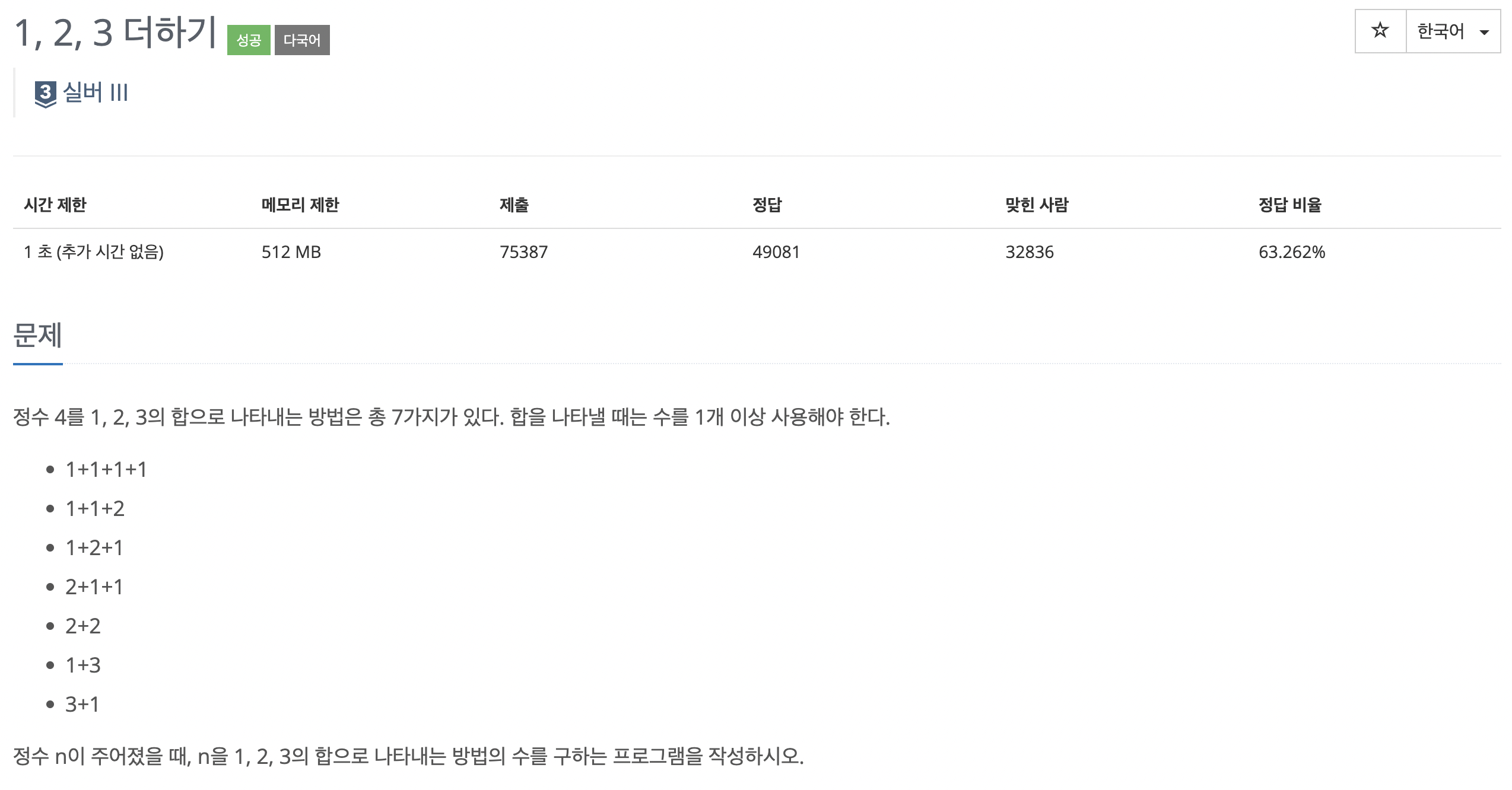 9095번: 1, 2, 3 더하기
