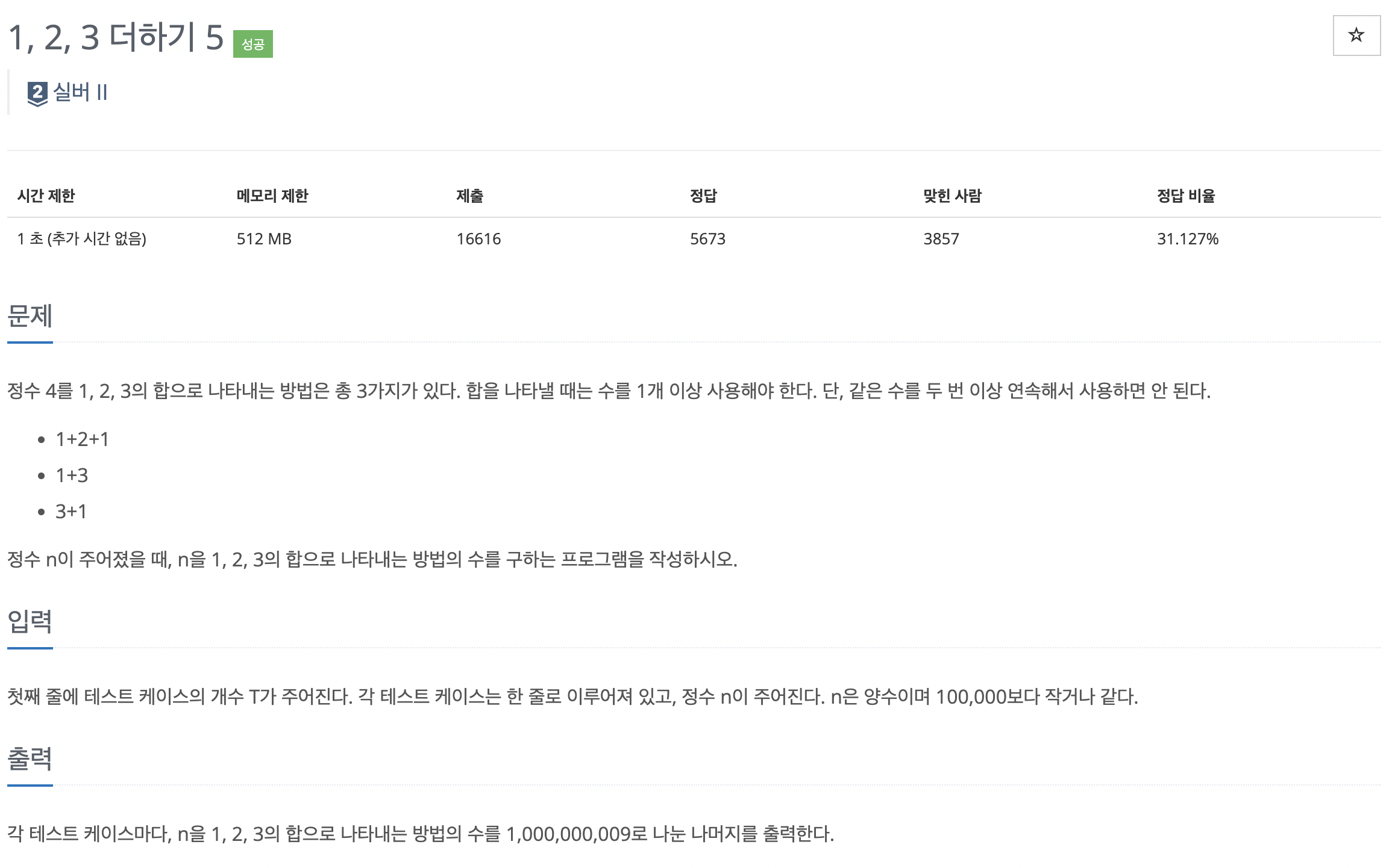각 테스트 케이스마다, n을 1, 2, 3의 합으로 나타내는 방법의 수를 1,000,000,009로 나눈 나머지를 출력한다.