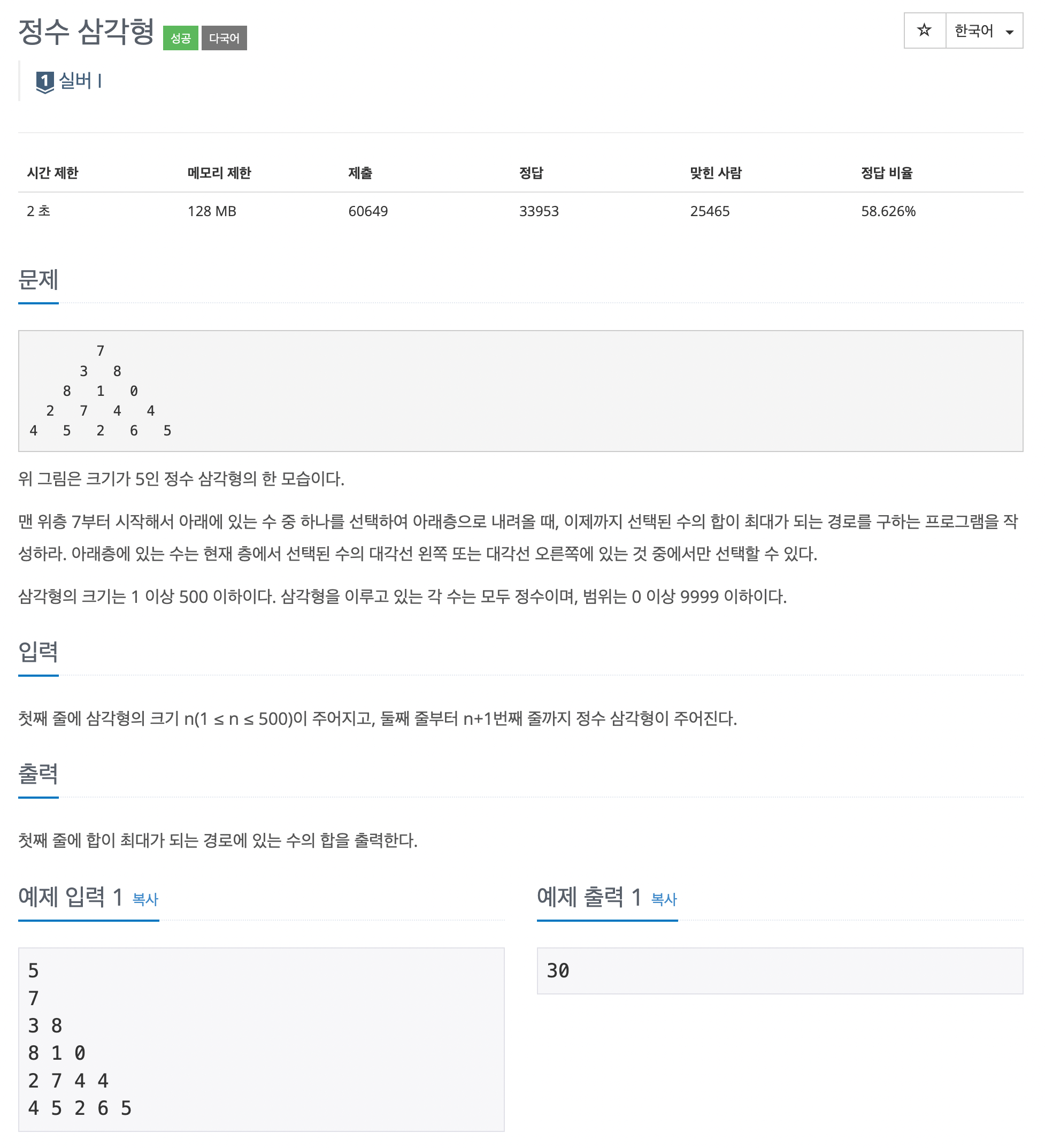 첫째 줄에 삼각형의 크기 n(1 ≤ n ≤ 500)이 주어지고, 둘째 줄부터 n+1번째 줄까지 정수 삼각형이 주어진다.