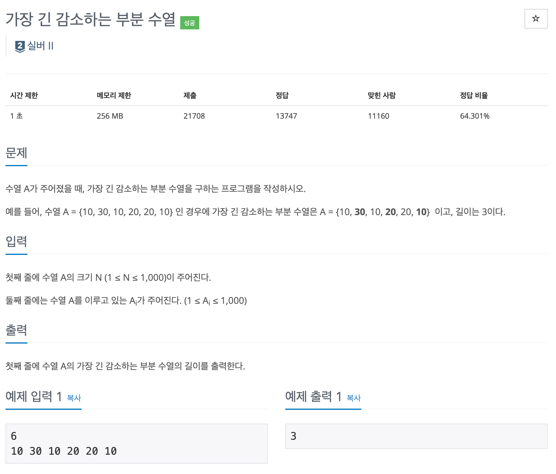 수열 A가 주어졌을 때, 가장 긴 감소하는 부분 수열을 구하는 프로그램을 작성하시오. 예를 들어, 수열 A = {10, 30, 10, 20, 20, 10} 인 경우에 가장 긴 감소하는 부분 수열은 A = {10, 30, 10, 20, 20, 10}