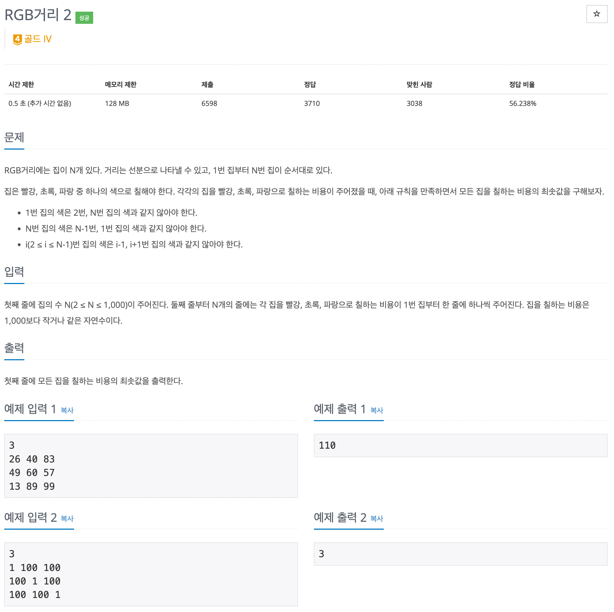 RGB거리 문제와 원리는 같다. 하지만 1번째 집과 맨 끝 집의 색깔이 같으면 안된다는 조건이 붙는다.