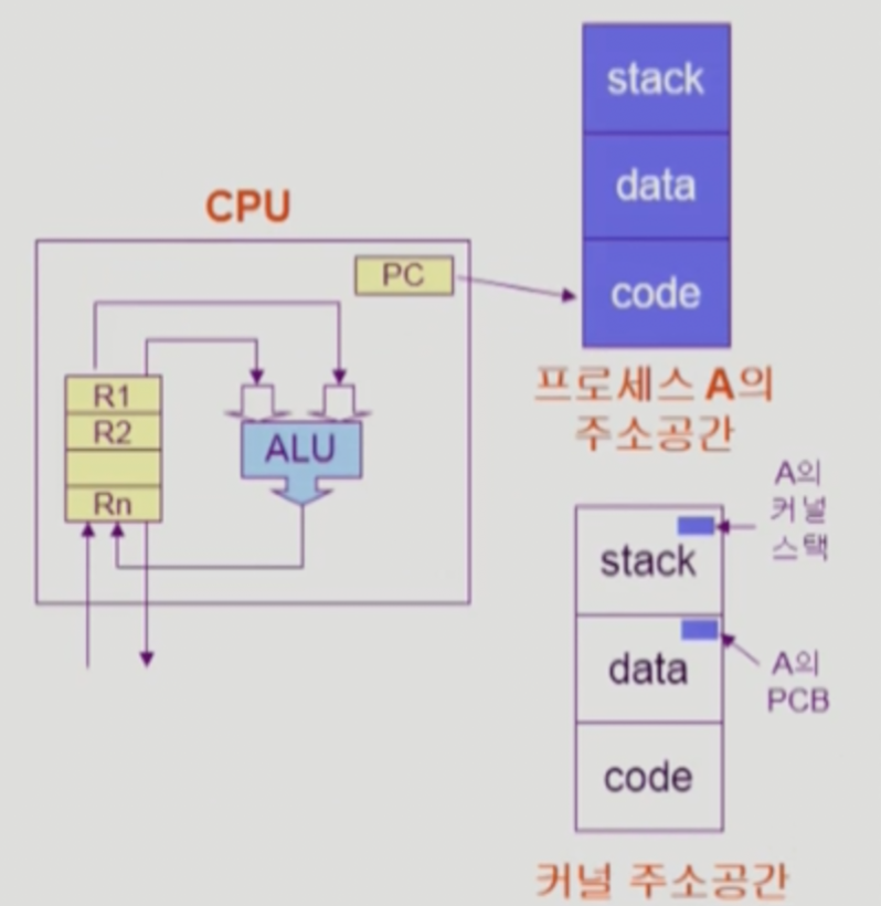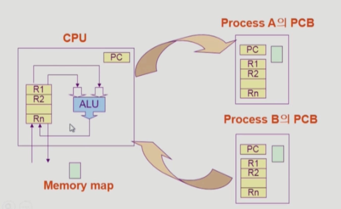 - PCB(Process Control Block) : 프로세스 하나 실행될때마다 하나씩 두면서 관리하는 역할. (cpu얼마나 주고 메모리 얼마주지? 나쁜짓 안하나?) -> cpu 상태뿐만아니라 운영체제가 이놈을 어떻게 생각하는지도 알아야한다는 것