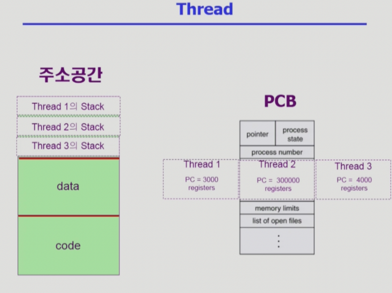 - PC 여러 개, 각 실행단위마다 어떤 레지스터, 어떤 코드를 별도로 유지한다. 스택도 별도로 두게 된다.