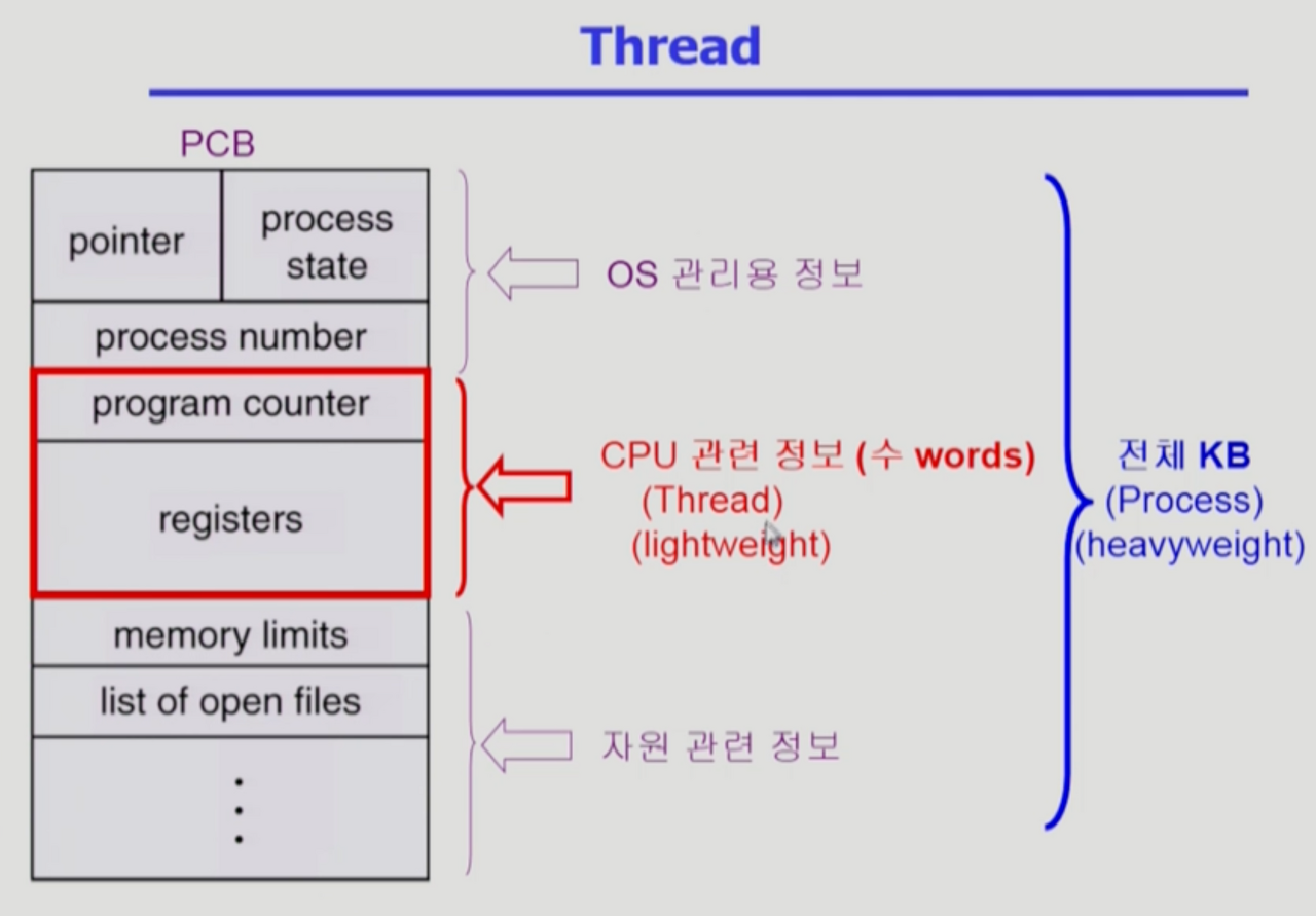 - 동일한 일을 하는 프로세스를 여러개 만든다면 별도의 프로세스를 만든다면 주소공간이 여러개 만들어지고 낭비가 생긴다. 주소공간을 하나 띄워놓고, 각 다른 코드 부분을 수행하도록 시킬 수 있다.