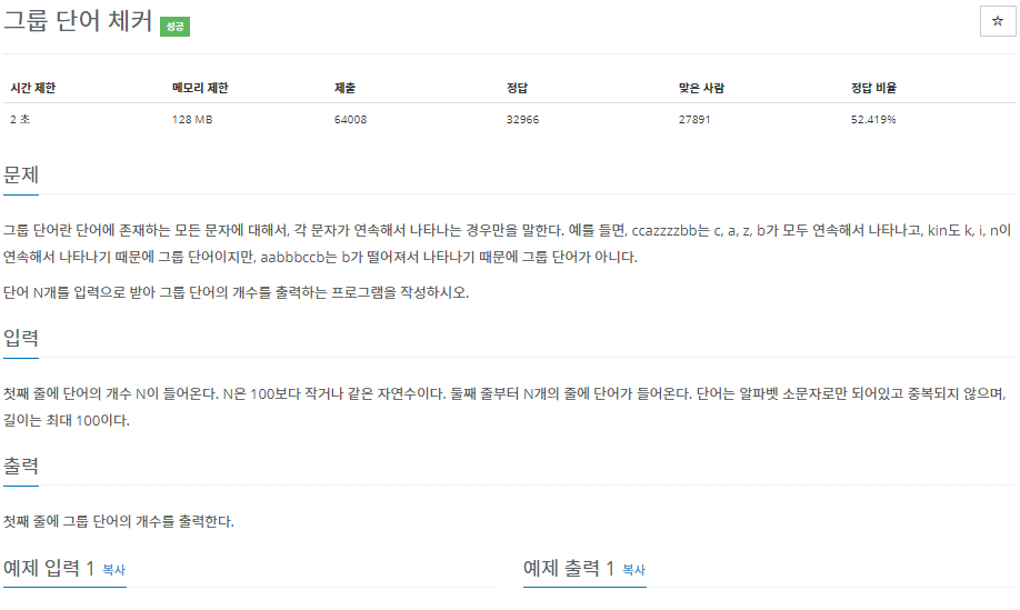그룹 단어란 단어에 존재하는 모든 문자에 대해서, 각 문자가 연속해서 나타나는 경우만을 말한다. 예를 들면, ccazzzzbb는 c, a, z, b가 모두 연속해서 나타나고, kin도 k, i, n이 연속해서 나타나기 때