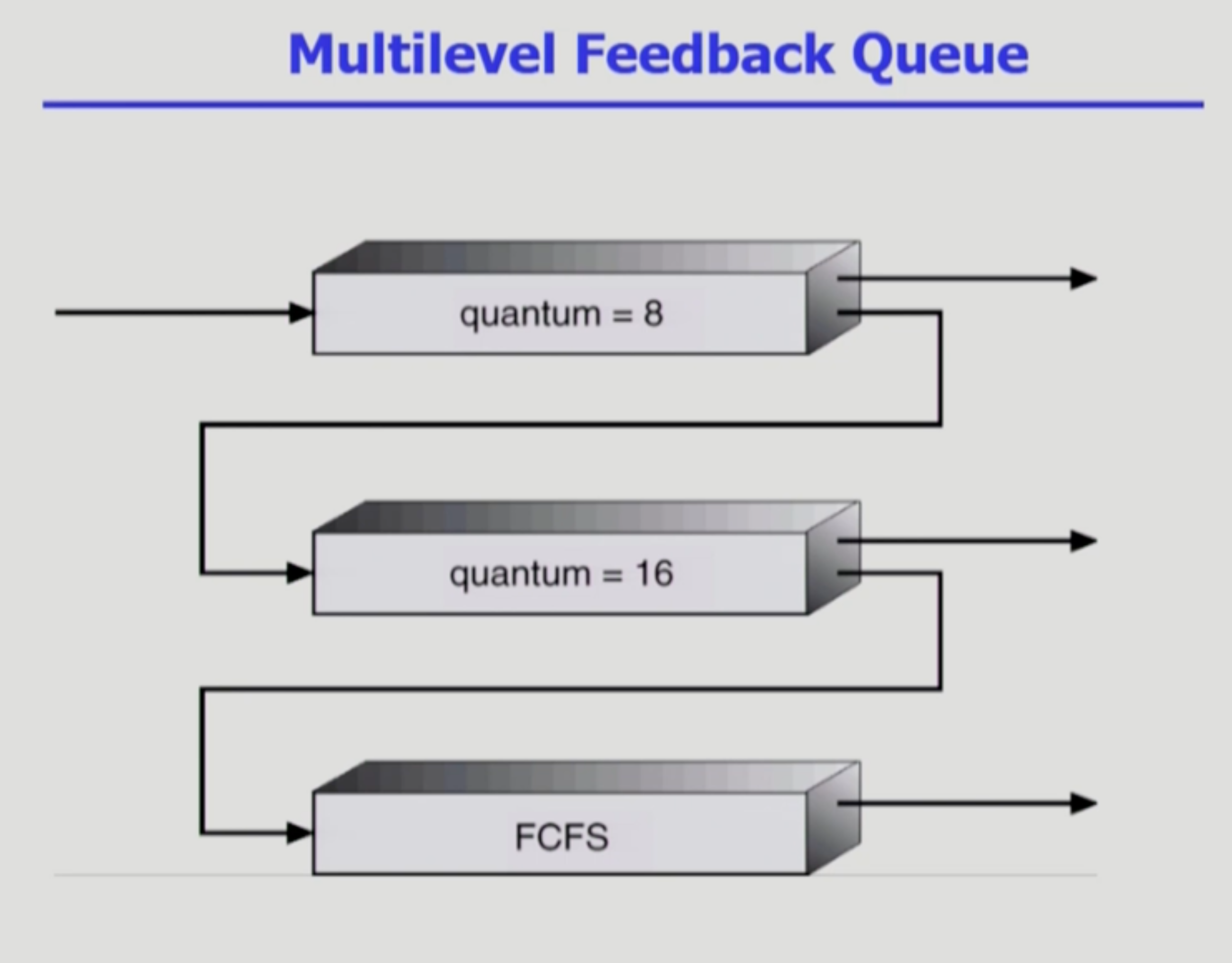 ### - 보통 RR을 사용하며 처음 들어오는 프로세스 우선순위 가장 높은 큐에 넣고, 내려갈수록 할당 시간을 길게 주고, 제일 아래는 FCFS 사용한다. 맨 위에 큐 비면 다음 큐 작업하는 방식