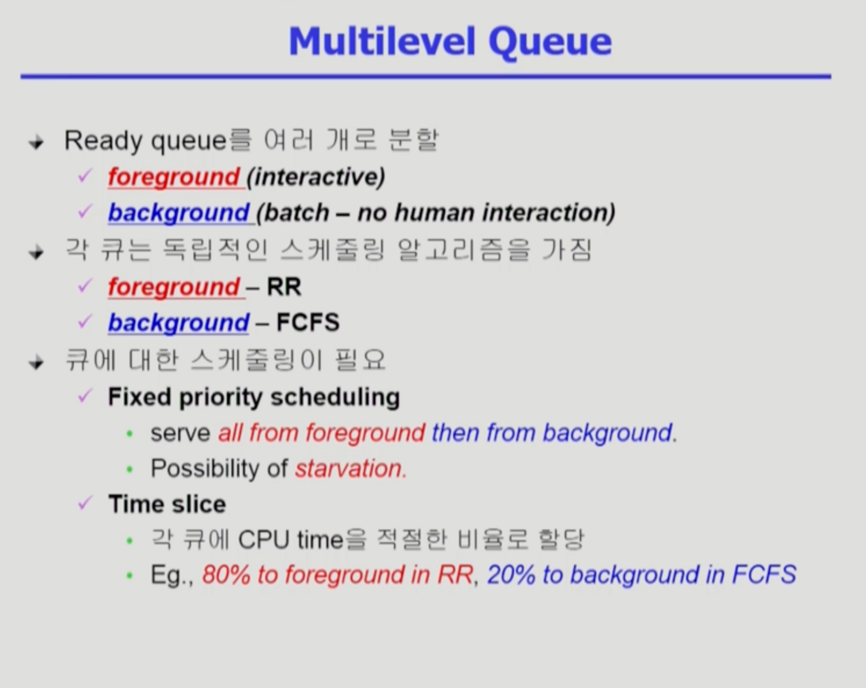 - 레디큐를 여러 개로 분할한다. -> interactive한 foreground와 interactive하지 않은 일괄처리를 하는 background