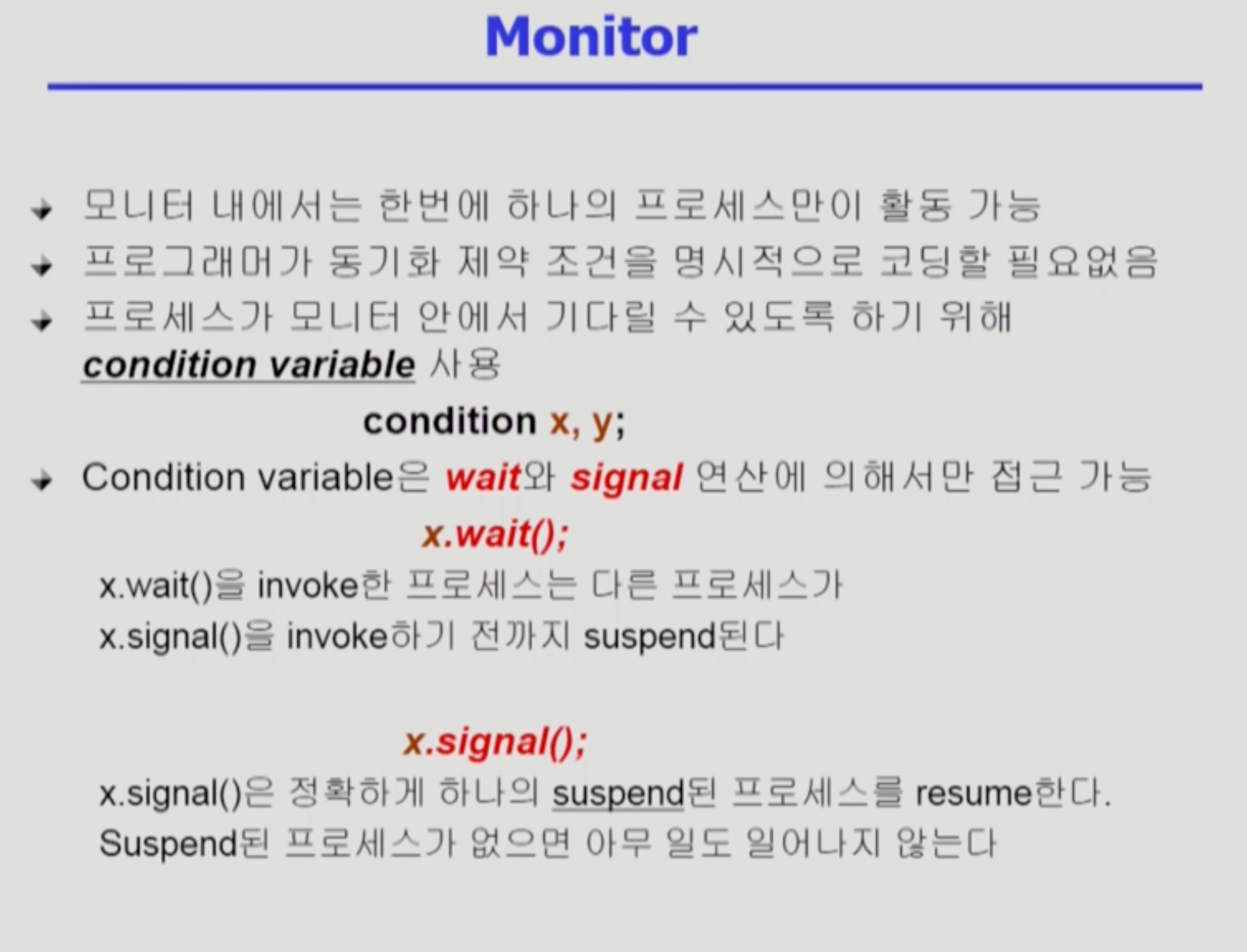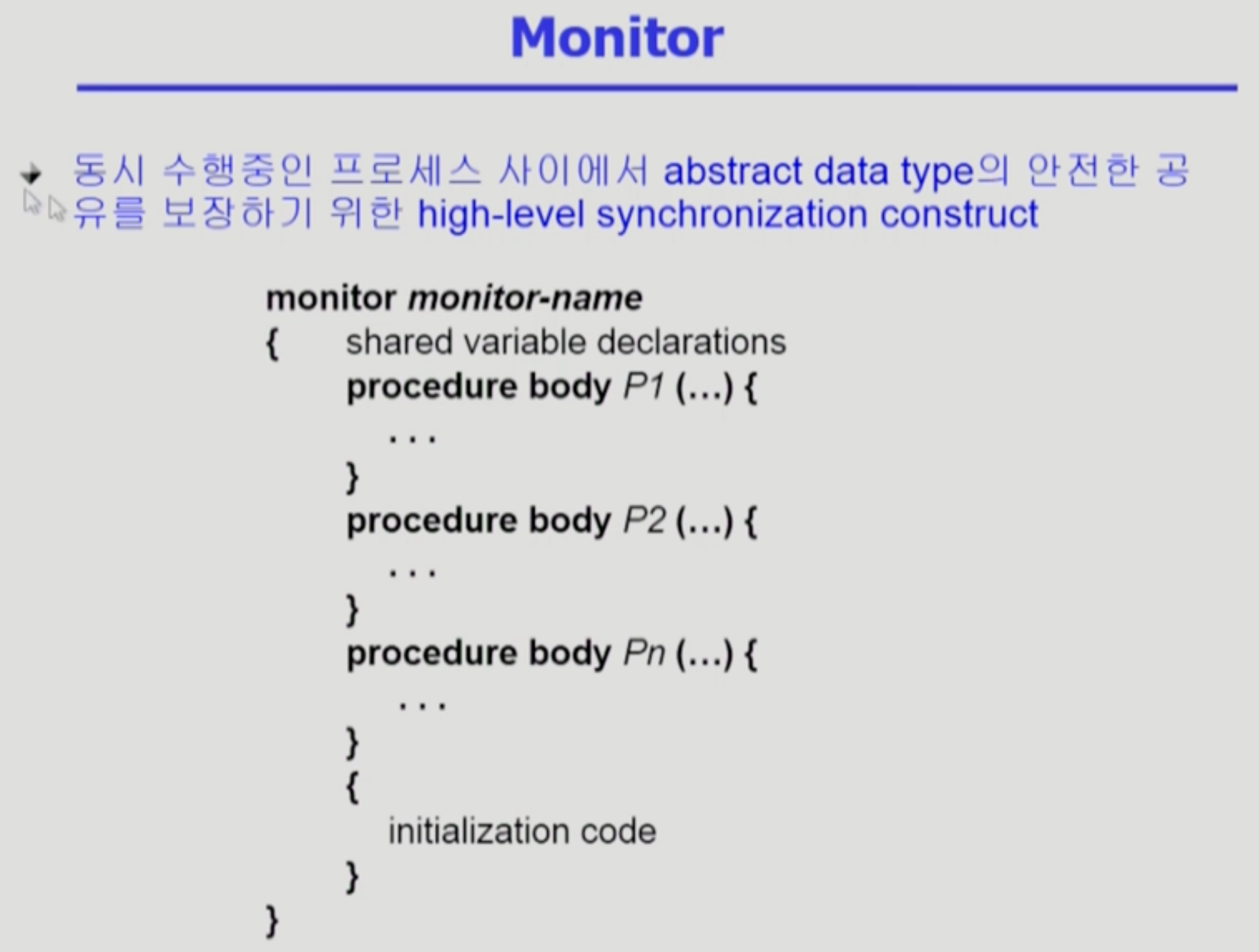 - 공유 버퍼가 모니터 안에 정의. 내부 코드를 실행해야 생산이나 소비를 할 수 있다. semaphore처럼 lock/unlock가 불필요하다.