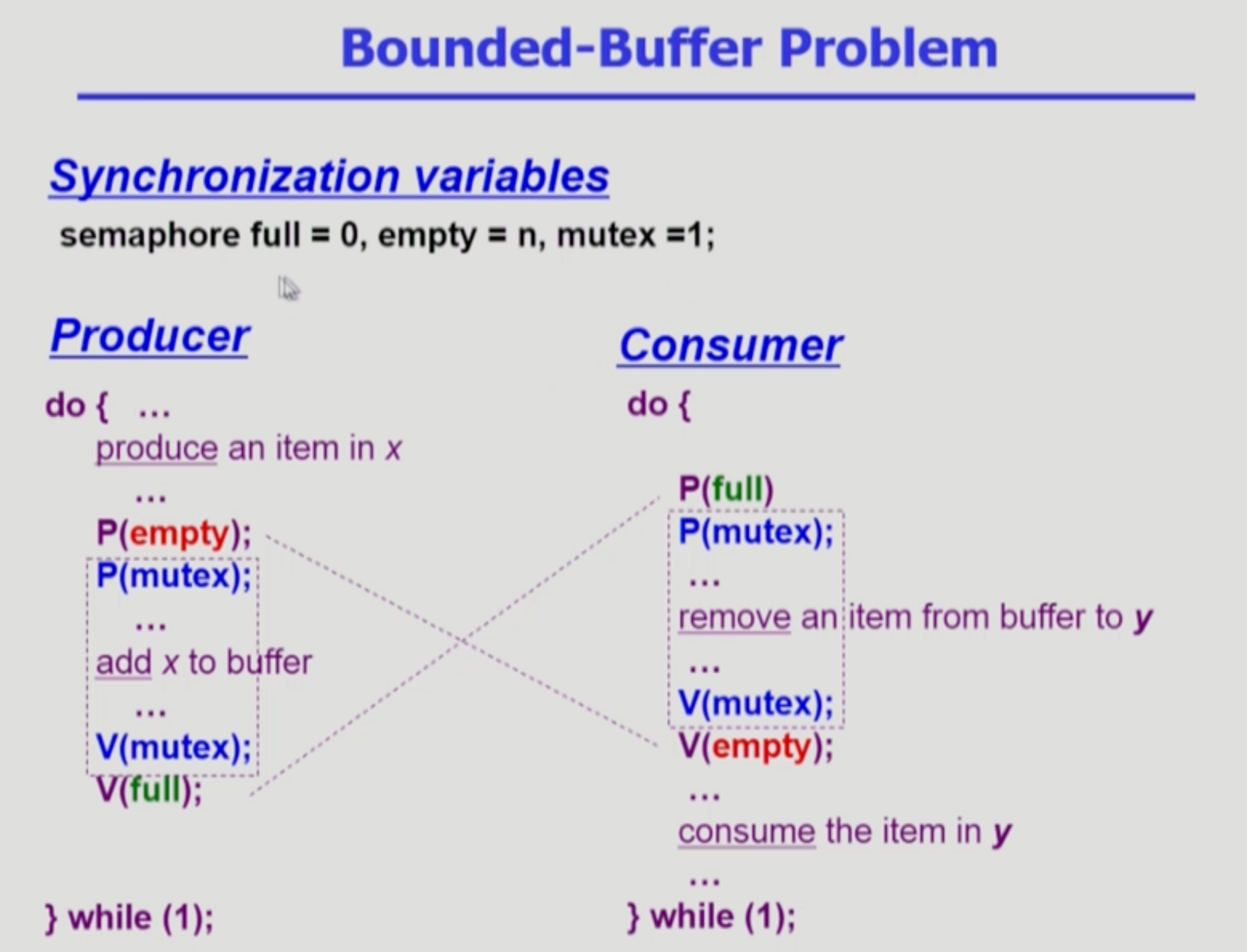 - 반대로 소비자가 다 꺼내갔는데, 소비자가 또 온 경우. full 버퍼가 소비자에겐 자원이고, 생산자를 기다려야한다.