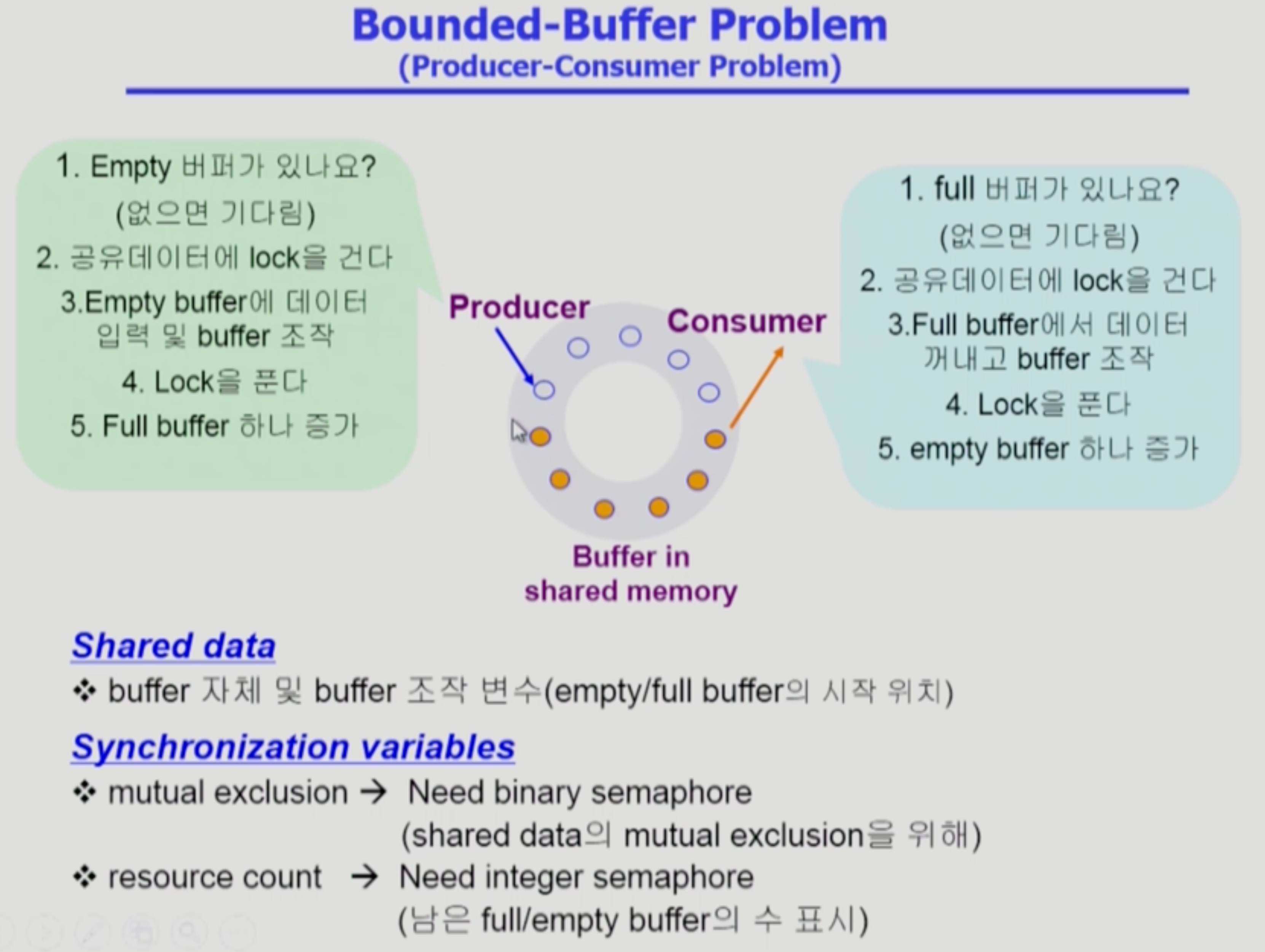 - 만약 처음에 full 버퍼가 없다면 생산자가 데이터를 만들어 넣어 증가시킬때까지 기다림