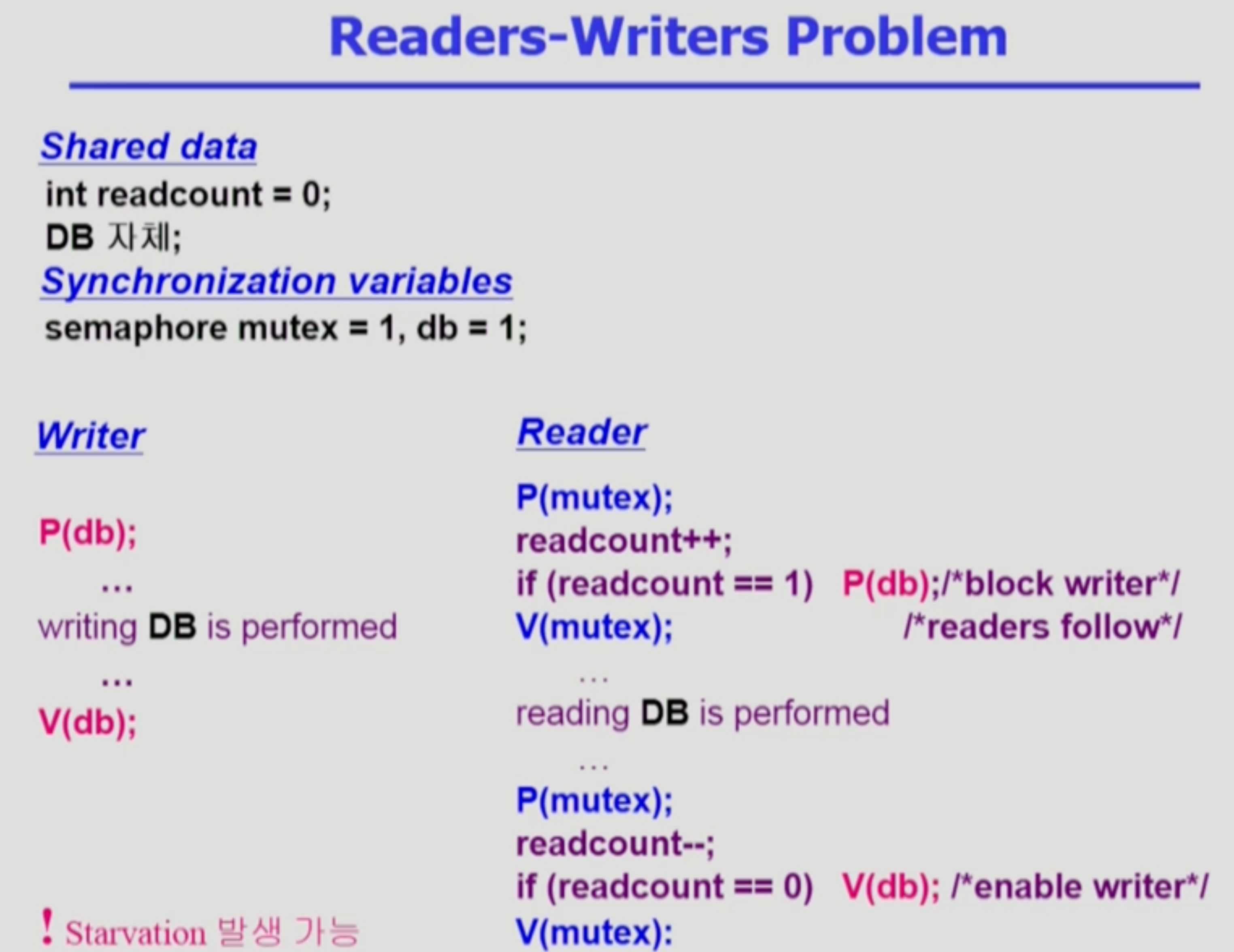 - readcount도 공유되기 때문에, 동기화 문제가 생길 수 있다. 따로 lock/unlock을 해준다.(P(mutex), V(mutex))