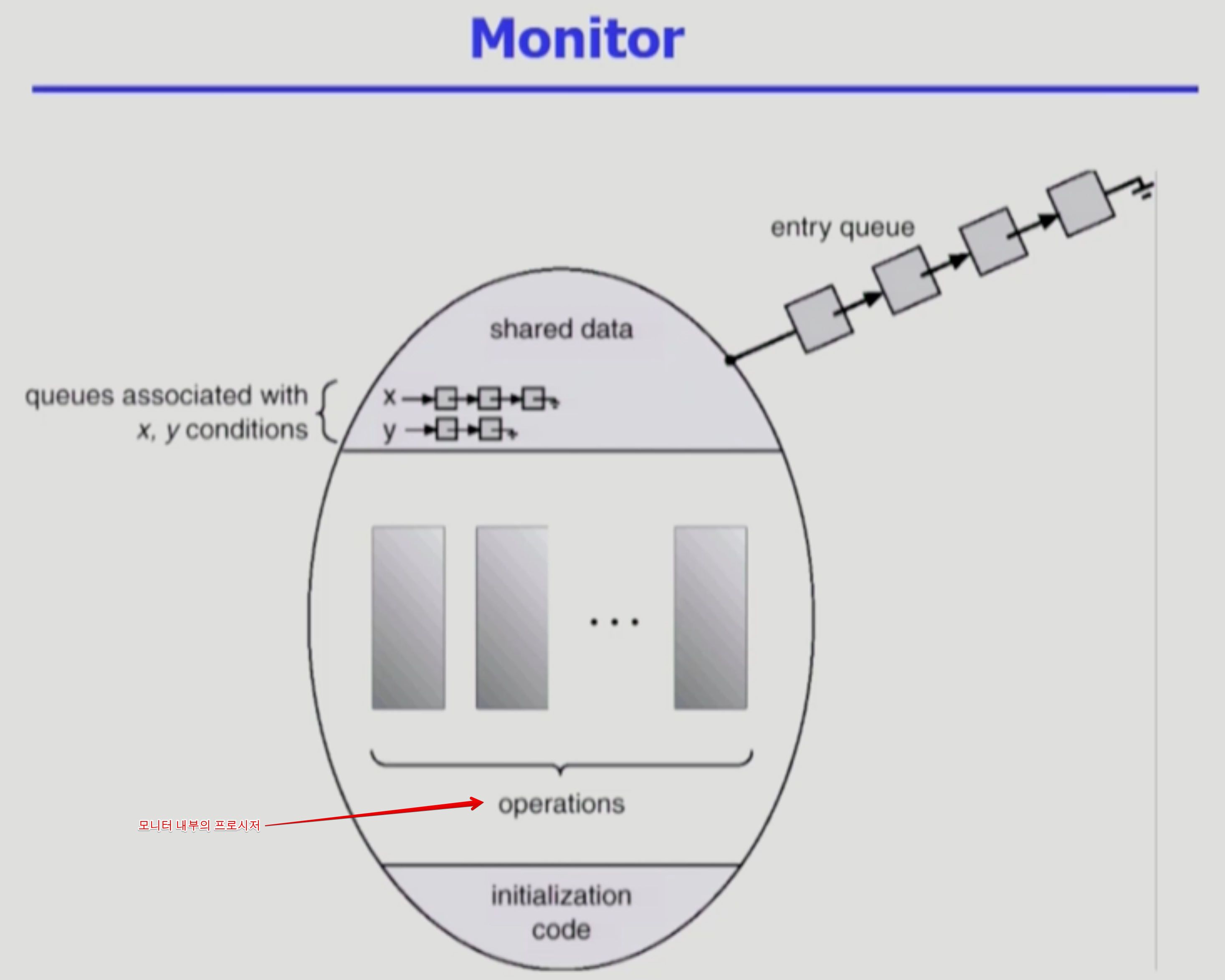 - 모니터 내부에서 원천적으로 동시에 프로시저가 여러개 실행이 안되도록 통제 권한 줌 -> 프로그래머가 lock을 걸 필요가 없다.