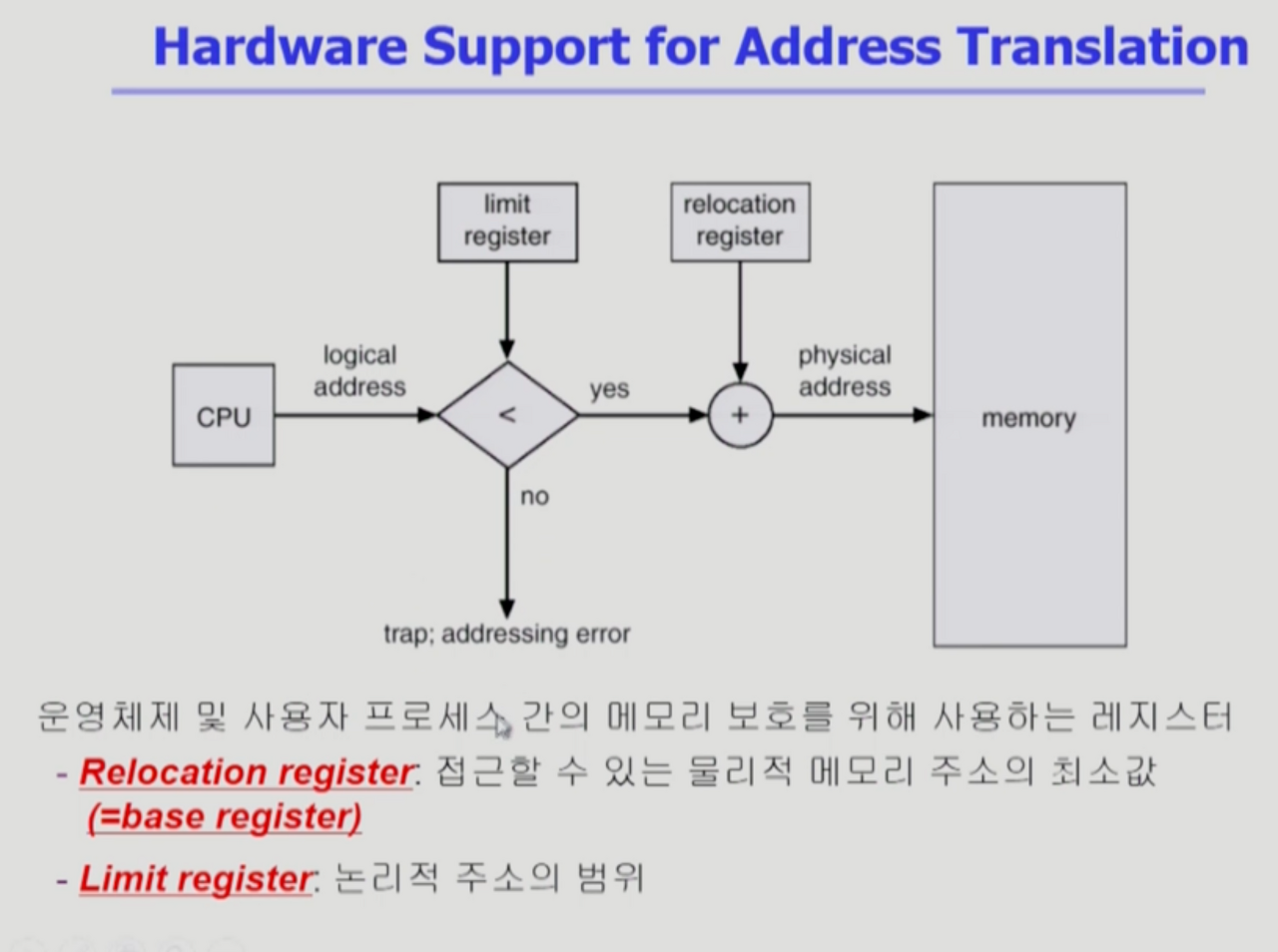 - 두 개의 레지스터 이용해서 주소 변환(limit register, relocation register)