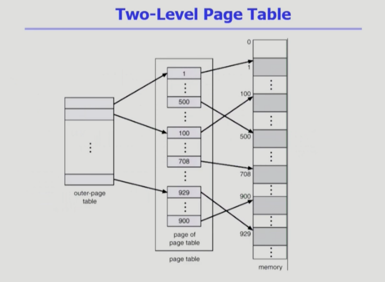 - 보통 페이지 크기 4kb -> 엔트리가 실제로 100만개 정도.. -> 용량이 크기 때문에 cpu의 레지스터에 못 들어감 -> 심지어 프로그램마다 있다. -> 메모리에 집어넣어 버림