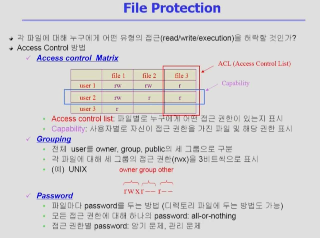 메모리에 대한 프로텍션은 read/write 권한이 있는가 정도만 얘기했었다. 메모리라는 것은 프로세스마다 별도로 가지기 떄문에 결국에는 자기 혼자만 보기 때문이다. 하지만 파일에 대한 protection은 여러 사용자와 프로그램이 같이 사용할 수 있기 때문에, 접근 권한이 누구한테 있는지, 어떤 연산이 가능한지 두 가지가 있어야 한다.