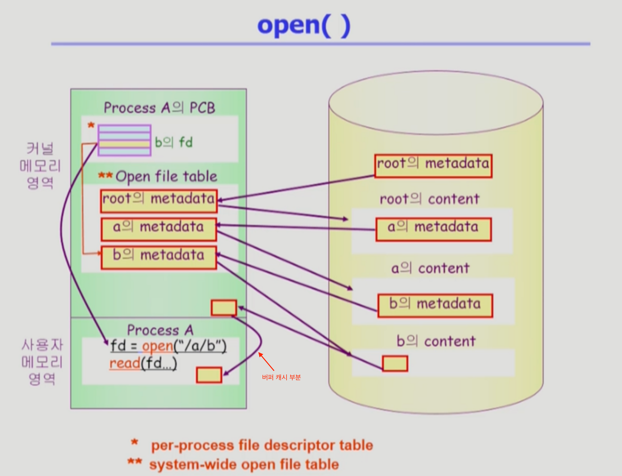 - b의 위치는 b의 metadata에 나와있는데, 이미 메모리에 올라와 있으며, 메모리에 올라온 metadata의 위치는 fd가 가지고 있다. fd의 숫자만 가지고 read/write를 처리할 수 있다.