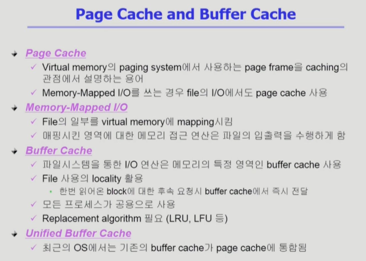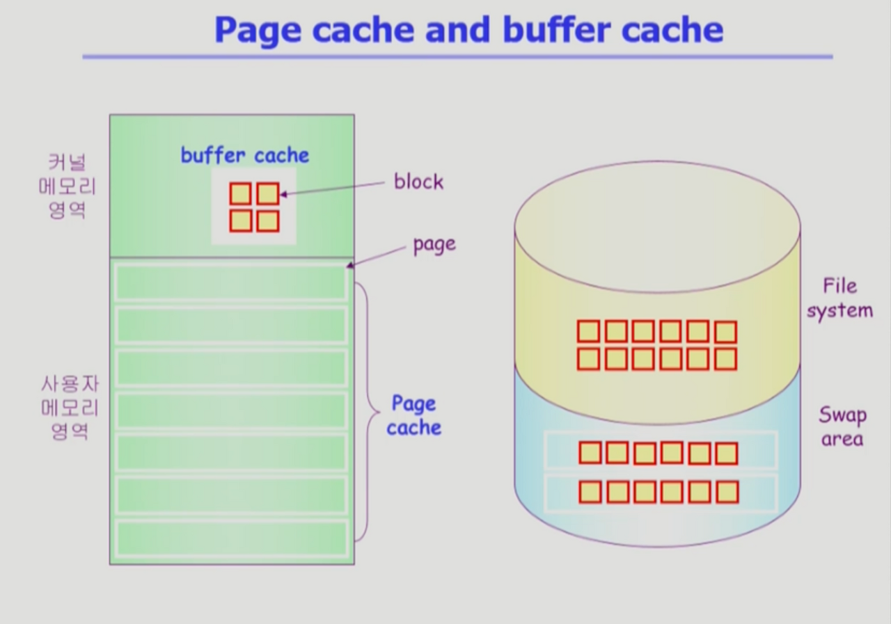 - 페이지 보통 4kb, 블록 512b -> 최근에는 두개가 합쳐지면서 버퍼캐시에도 페이지크기(4kb)로 블록들을 관리