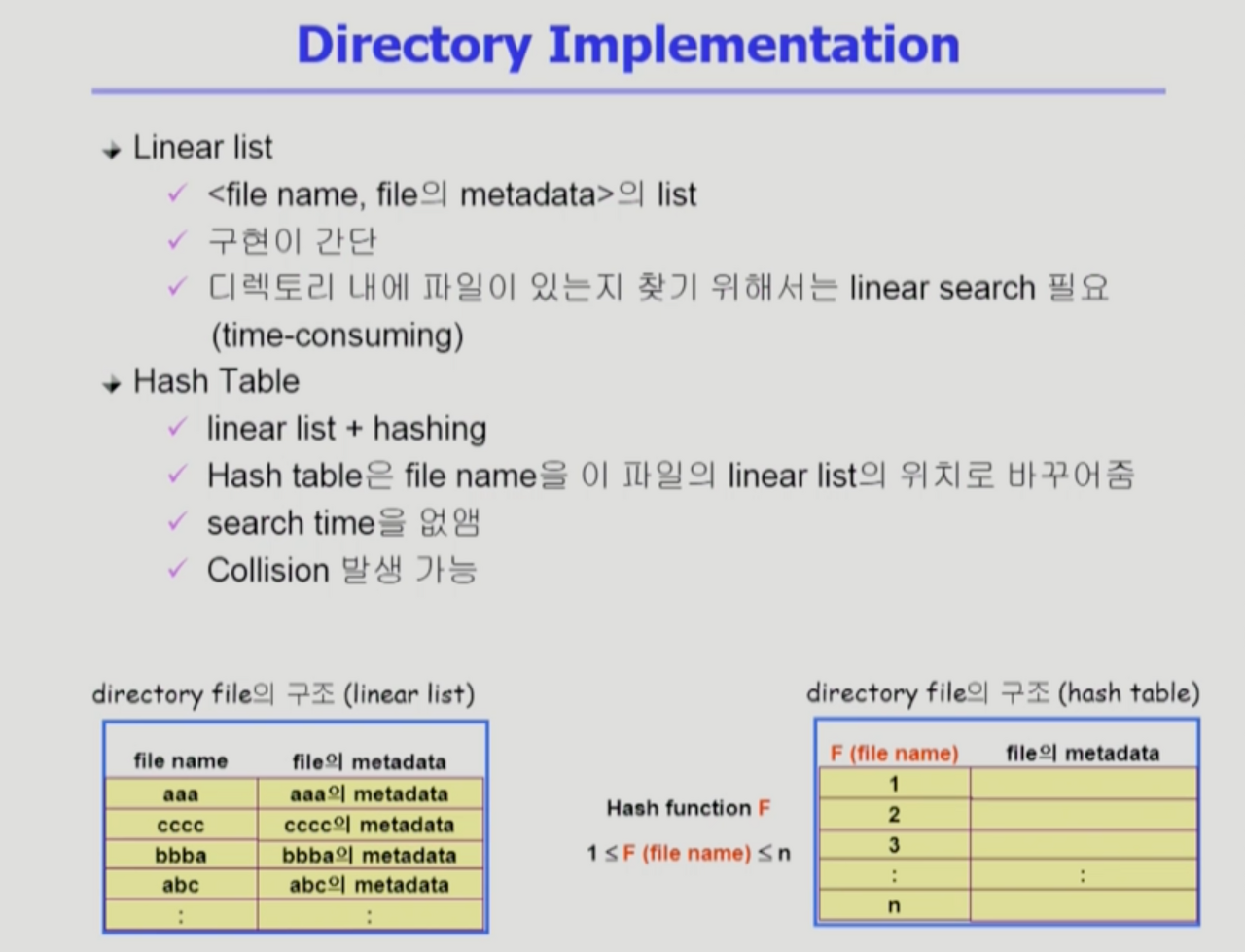 - hash table은 file name을 이 파일의 linear list의 위치로 바꾸어줌