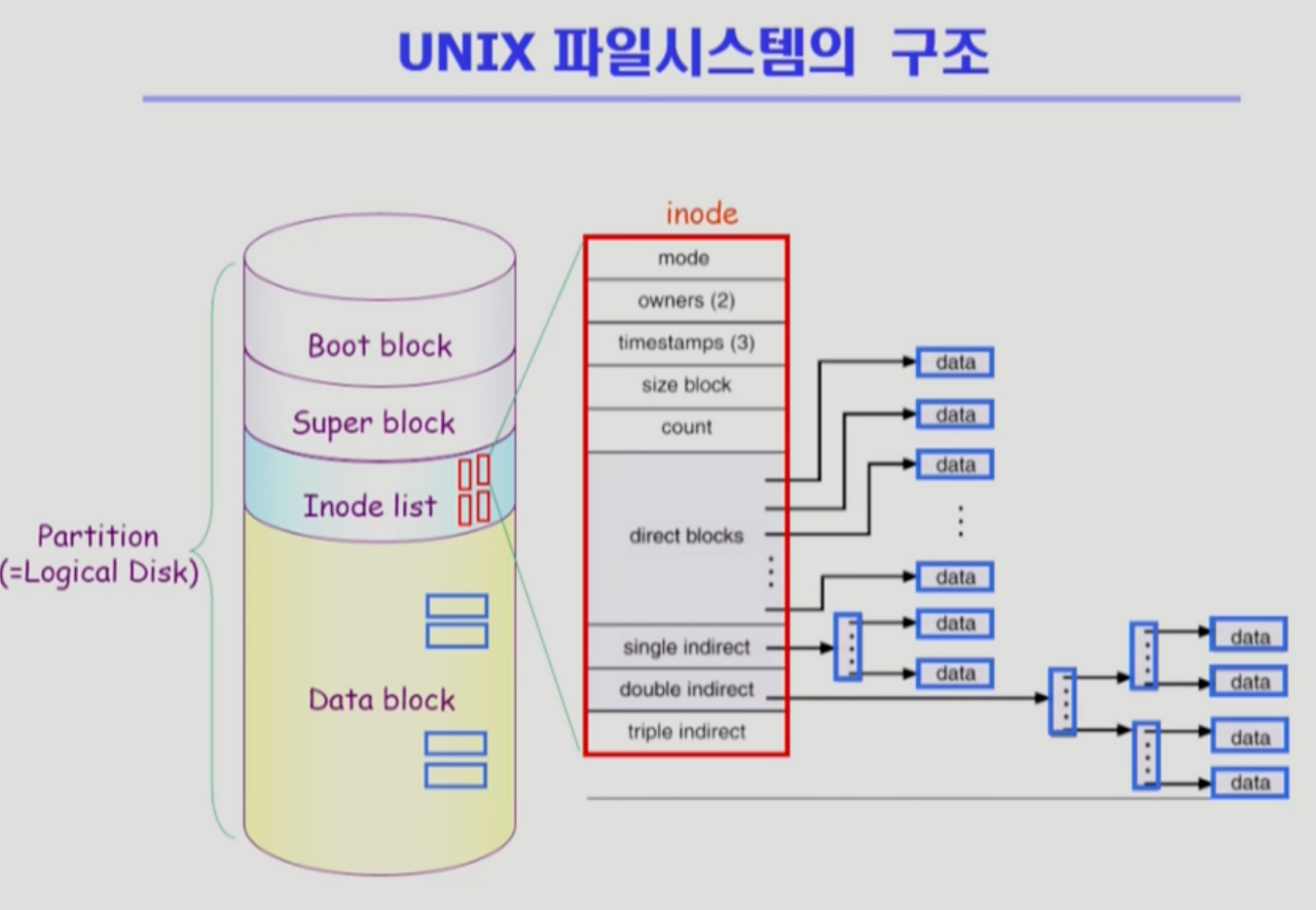 - 어떤 파일시스템이든 제일 앞에 boot block. 0번 블럭 메모리에 올리면 boot block