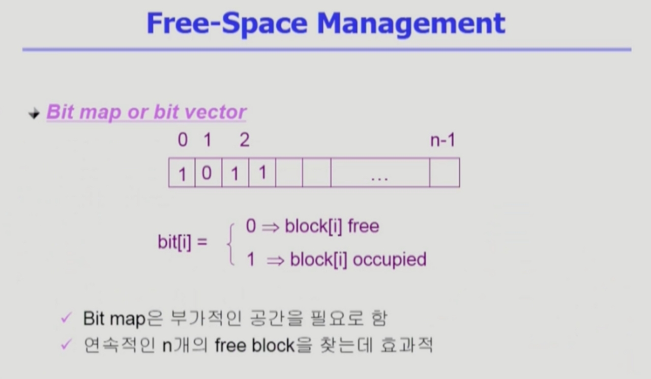 - UNIX의 경우 각각의 블록별 번호들이 있고, Super block부분에 사용중인지 여부를 비트로 나타냄.(0 or 1)