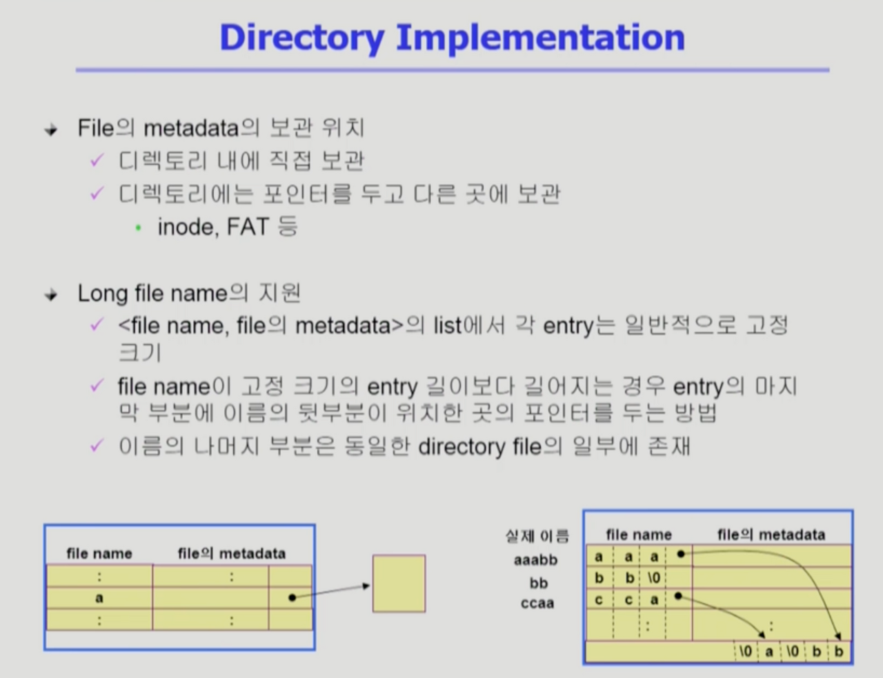 - 실제 파일시스템의 구현에서 디렉토리가 모든 메타데이터를 가지고 있지는 않다. 특히 UNIX의 경우 디렉토리는 일부만 가지고 있고, 별도의 위치(Inode list)에 빼서 가지고 있다.