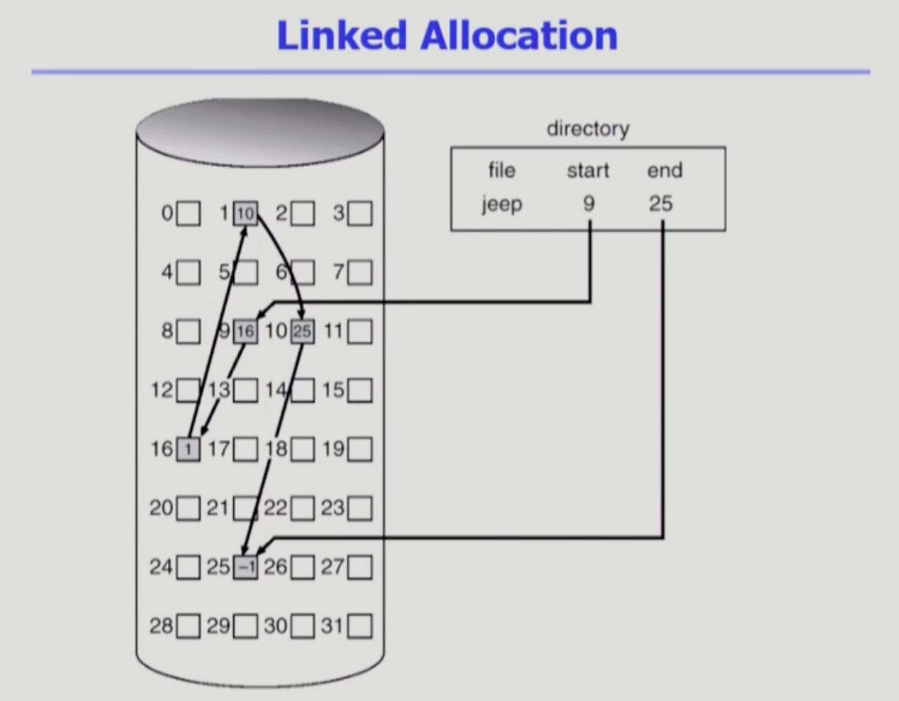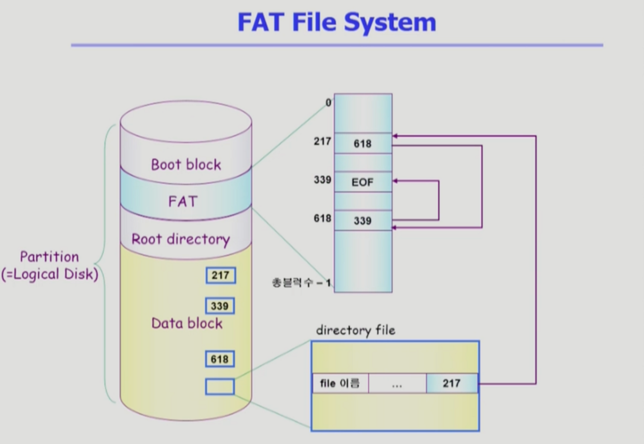 - 파일의 시작위치만 디렉토리가 가지고 있다. 해당 블럭을 찾아가서 파일의 내용이 더 있다면, 다음 블럭의 정보를 찾아간다.