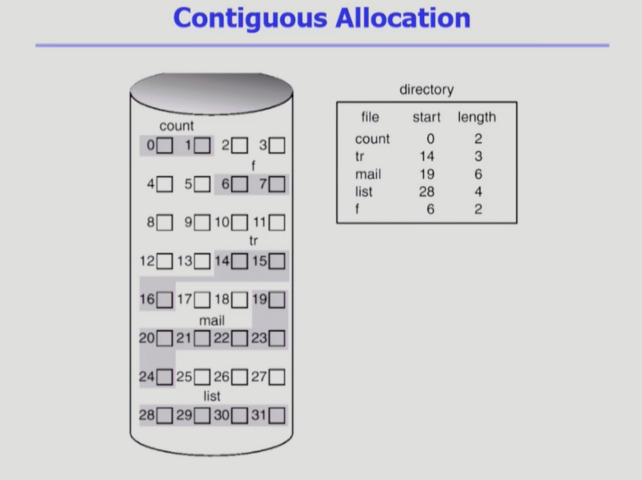 - 디스크 상에 연속해서 저장되는 방법