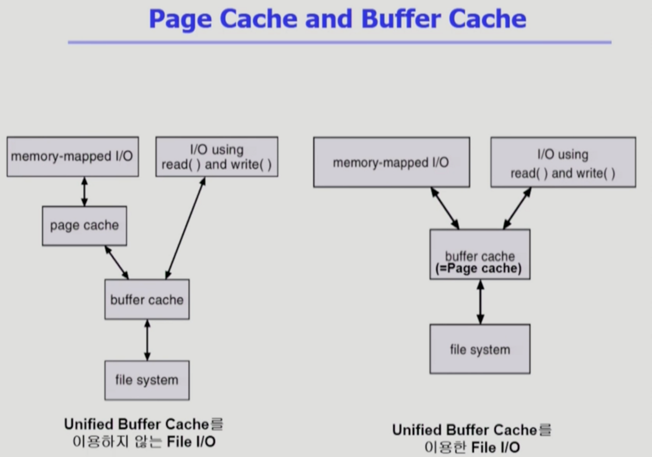- 최근에는 위 두개가 통합(Linux의 경우). 버퍼 캐시의 단위도 페이지(4kb)단위로 사용. 공간의 구분을 하지 않고 똑같이 페이지 단위로 사용하기도 한다.