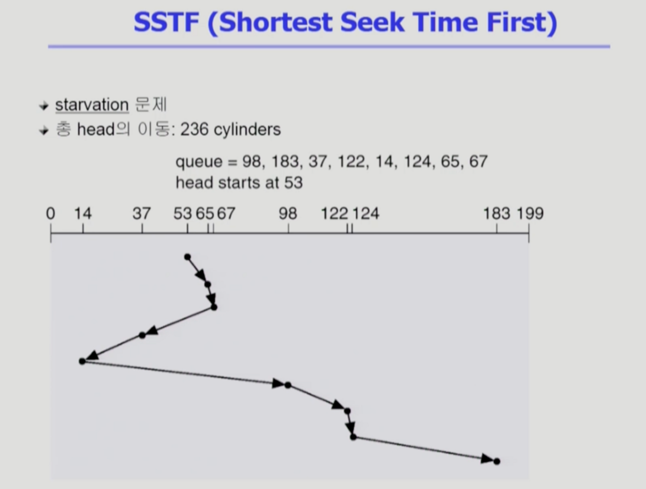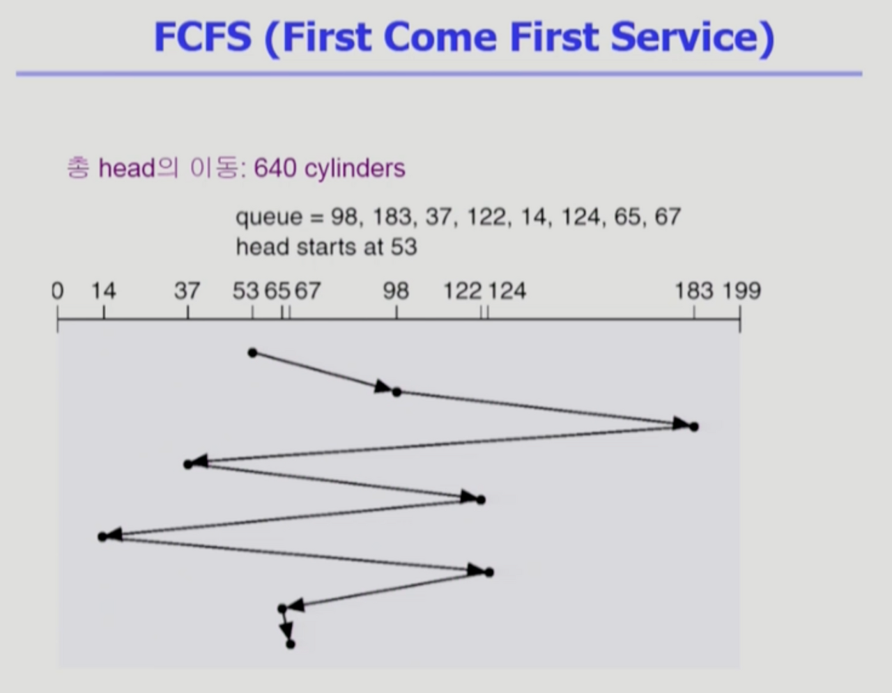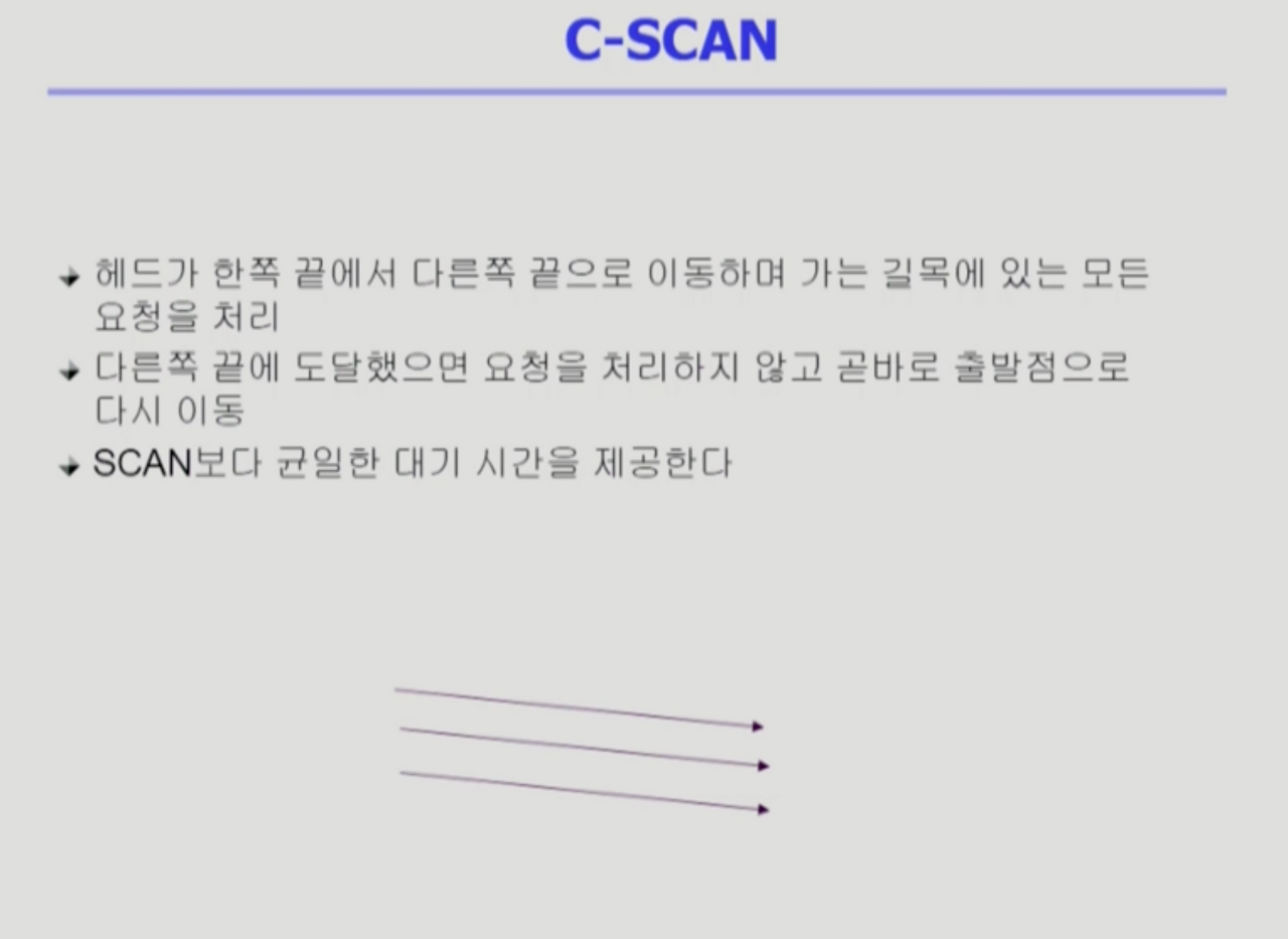 - 사실은 스케줄링 알고리즘이 구현되는 곳이 대부분 디스크 내부가 아니기때문에, (보통 운영체제쪽) 정확한 실린더 위치를 모를 수 있다. 스케줄러는 논리블럭 번호를 보고 스케줄을 하고, 대부분 맞아떨어진다. 내부에서 sector단위를 이용하는 것도 가능은 하다.