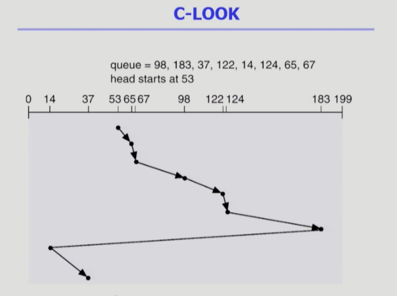 - 문제점 : 실린더 위치에 따라 대기시간이 다르다. 최악의 경우 왕복 전체를 기다려야한다. (가장자리의 요청인데, 헤드가 막 떠난 경우)