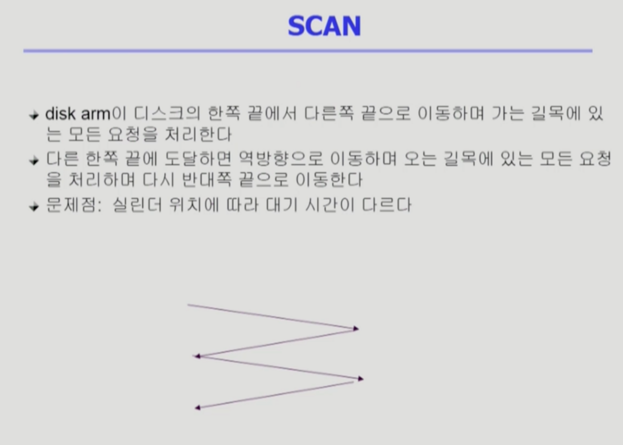 - 엘레베이터 스케줄링이라고도 한다. 기본적으로 디스크 스케줄링은 SCAN에 기반해서 사용한다.