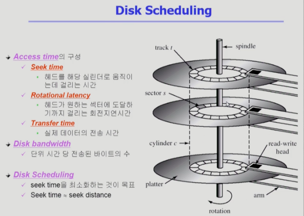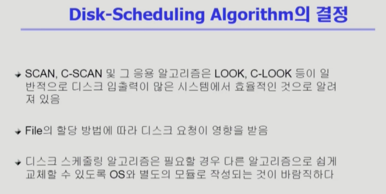 - 파일 할당 방법도 디스크 스케줄링의 성능에 영향을 미친다. ex)연속할당을 하면 헤드의 이동이 줄어들고, 산발적 할당을 하면 반대이다.