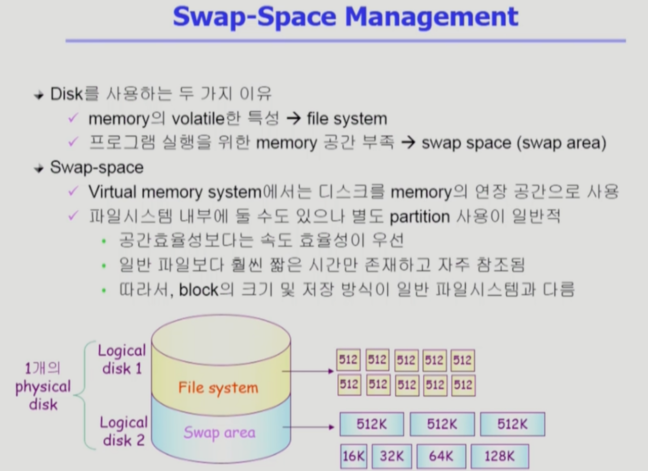 - swap area는 프로그램이 실행되는 동안 머무르던 프로세스의 주소공간들이 프로그램 끝나면 어짜피 사라진다. 물리적메모리의 연장공간으로 사용하는 개념이라 쫓겨날떄도 빠르게 디스크에 쓰고, 다시 올릴때도 빠르게 올려야한다. 속도 효율성을 우선으로 한다. seek time을 줄이기 위한 목적으로 큰 단위로 데이터를 올리고 내린다. 보통 512kb로 섹터의 1000배이다. 경우에 따라 16k~512k이기도 하다.