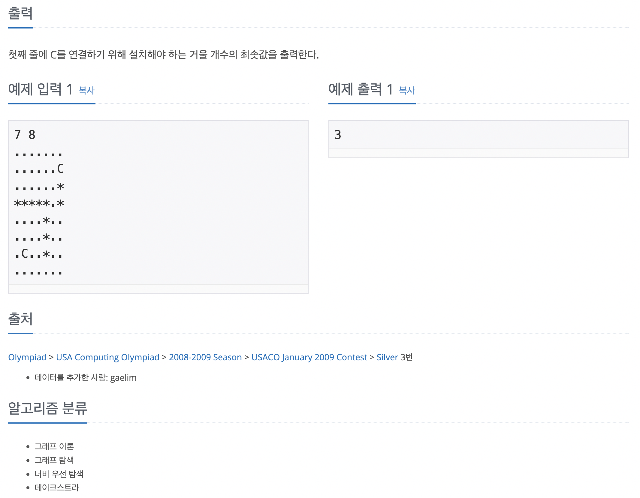 문제 6087번: 레이저 통신 크기가 1×1인 정사각형으로 나누어진 W×H 크기의 지도가 있다. 지도의 각 칸은 빈 칸이거나 벽이며, 두 칸은 'C'로 표시되어 있는 칸이다. 'C'로 표시되어 있는 두 칸을 레