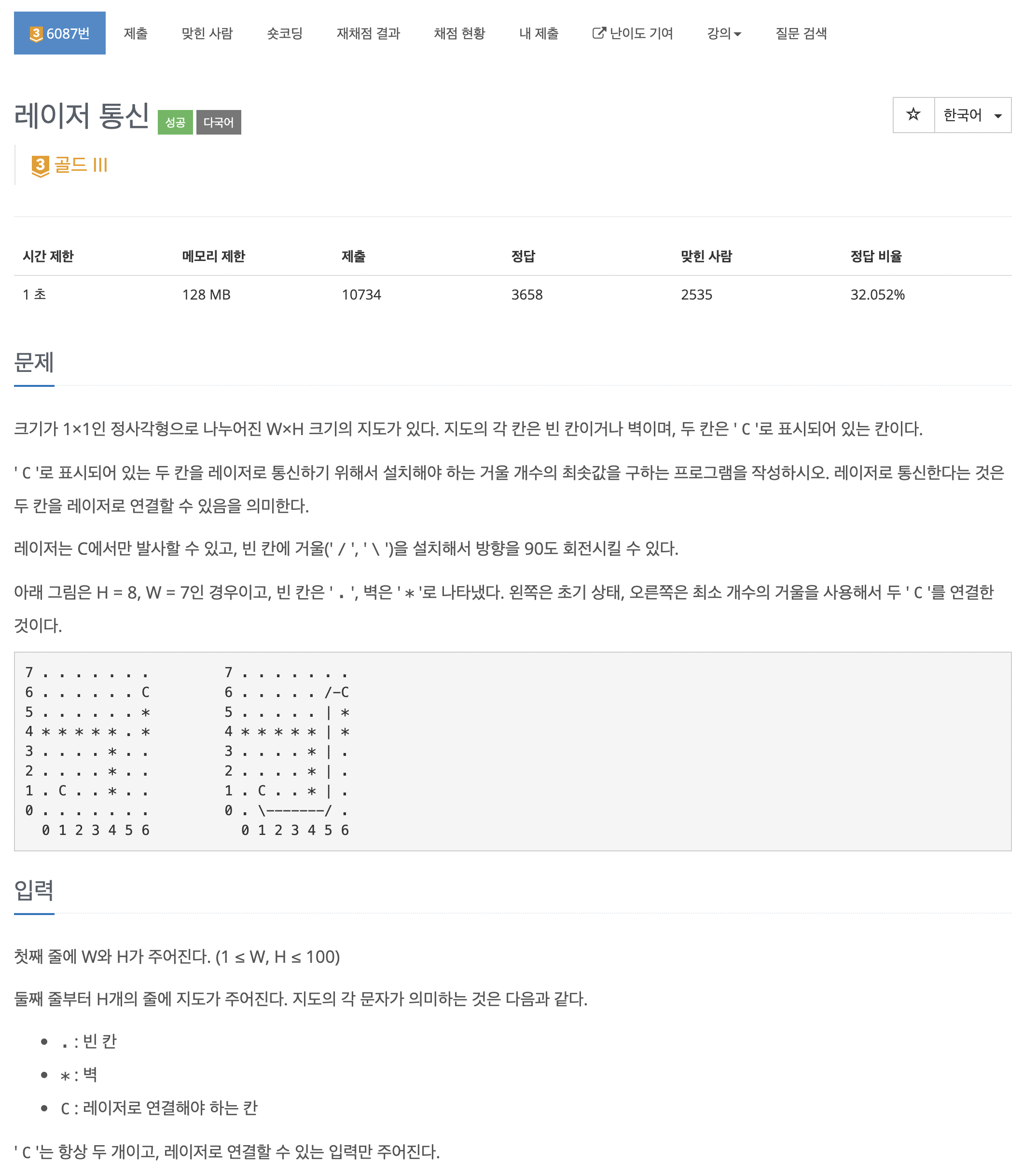 크기가 1×1인 정사각형으로 나누어진 W×H 크기의 지도가 있다. 지도의 각 칸은 빈 칸이거나 벽이며, 두 칸은 'C'로 표시되어 있는 칸이다. 'C'로 표시되어 있는 두 칸을 레이저로 통신하기 위해서