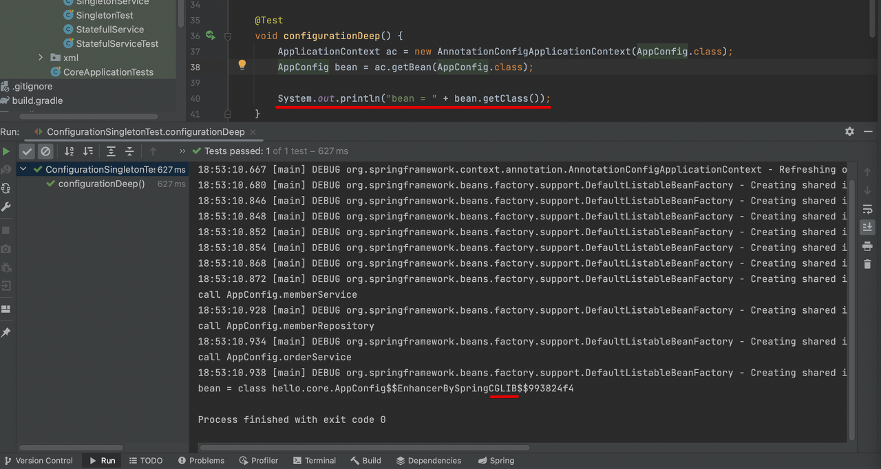 결론적으로 해당 클래스가 싱글톤을 보장시켜준다. 대략적으로 설명하면, Bean이 붙은 메서드마다 스프링 빈의 존재여부를 체크해서 등록하거나 반환해주는 코드가 동적으로 만들어진다.