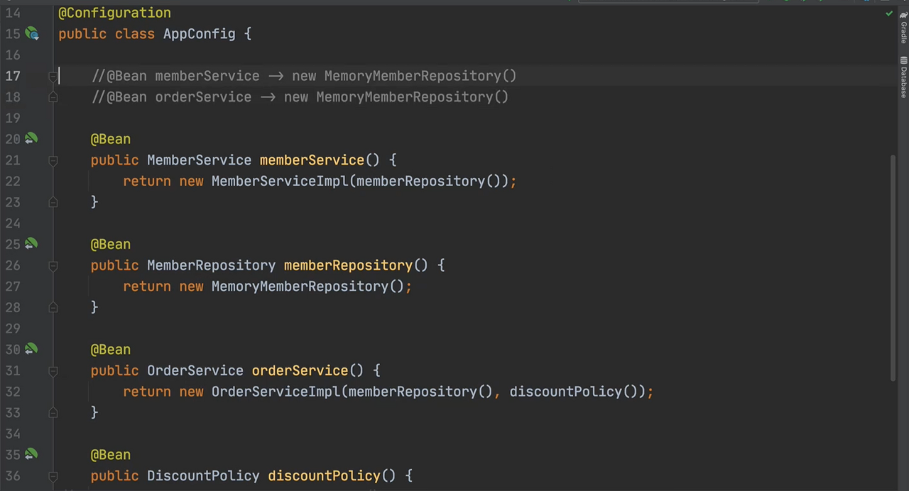 스프링 컨테이너는 @Configuration이 적용된 설정파일을 읽어서 빈을 등록한다. 하지만 스프링 컨테이너는 자바코드를 순서대로 읽을터인데, 여러 번 생성되는 객체는 어떻게 처리하는 것일까? 예시로 위 이미지에서 MemoryMemberRepository는 여러번 빈에 등록될 것이다.