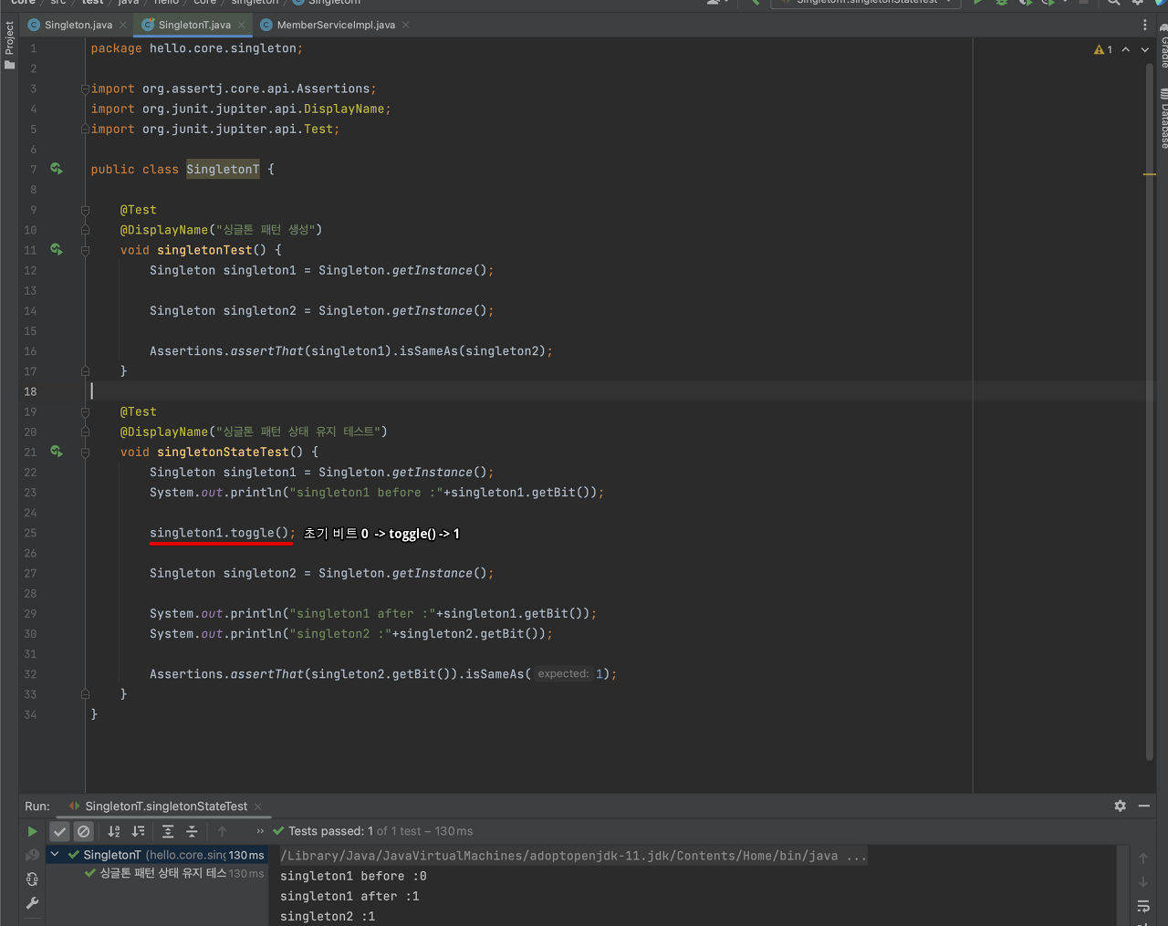 출력과 테스트를 통해 확인해보자. singleton1을 먼저 생성하고, 상태를 바꿔준 후, singleton2를 새로 생성했다.