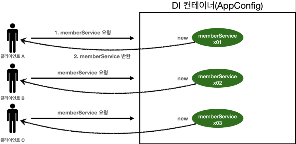 대부분의 스프링 애플리케이션은 웹 애플리케이션이며, 웹 애플리케이션은 보통 여러 고객이 동시에 요청을 하는 구조이다. 그렇다면 수 많은 고객들이 요청할때마다 객체가 생성된다면 메모리 낭비가 심해질 것이다.