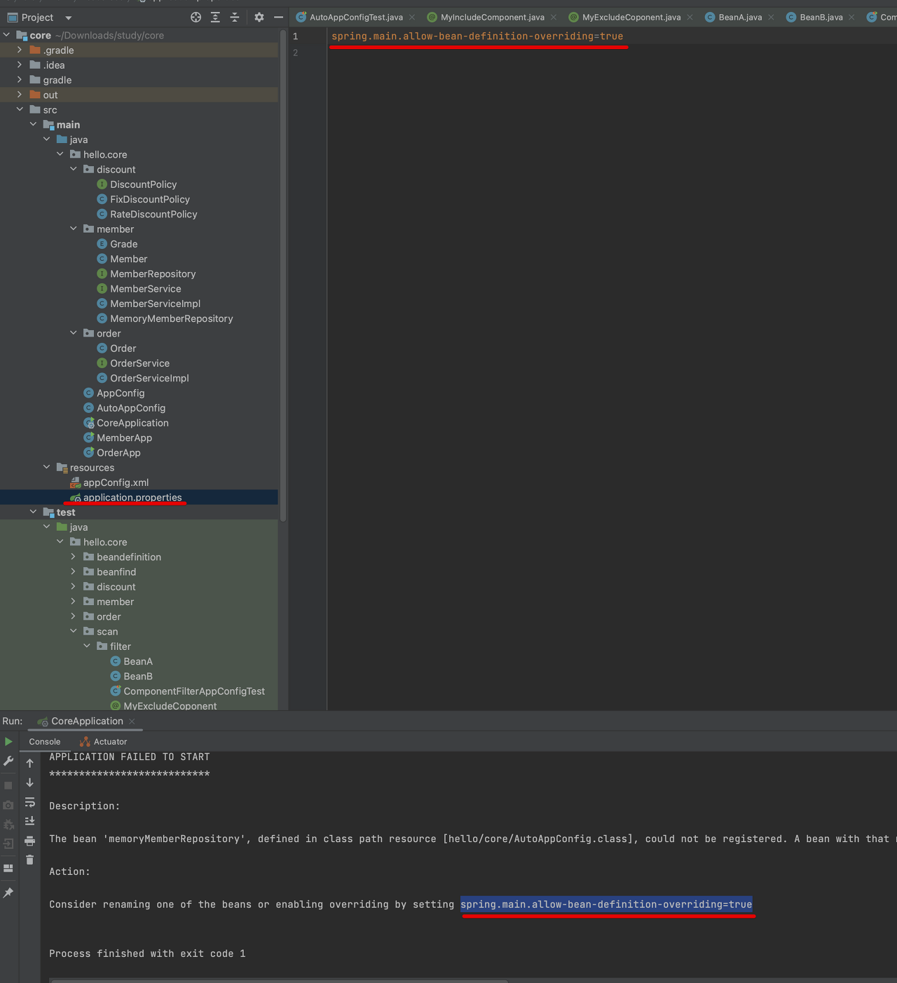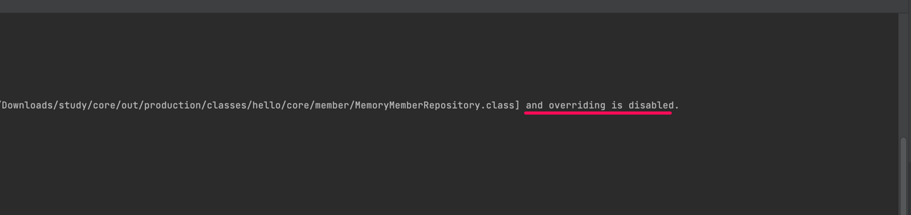 application-properties의 설정을 변경하면 오버라이딩을 허용할 수 있다. 오류 발생시 친절하게 하단에 설정 방법도 보여준다.