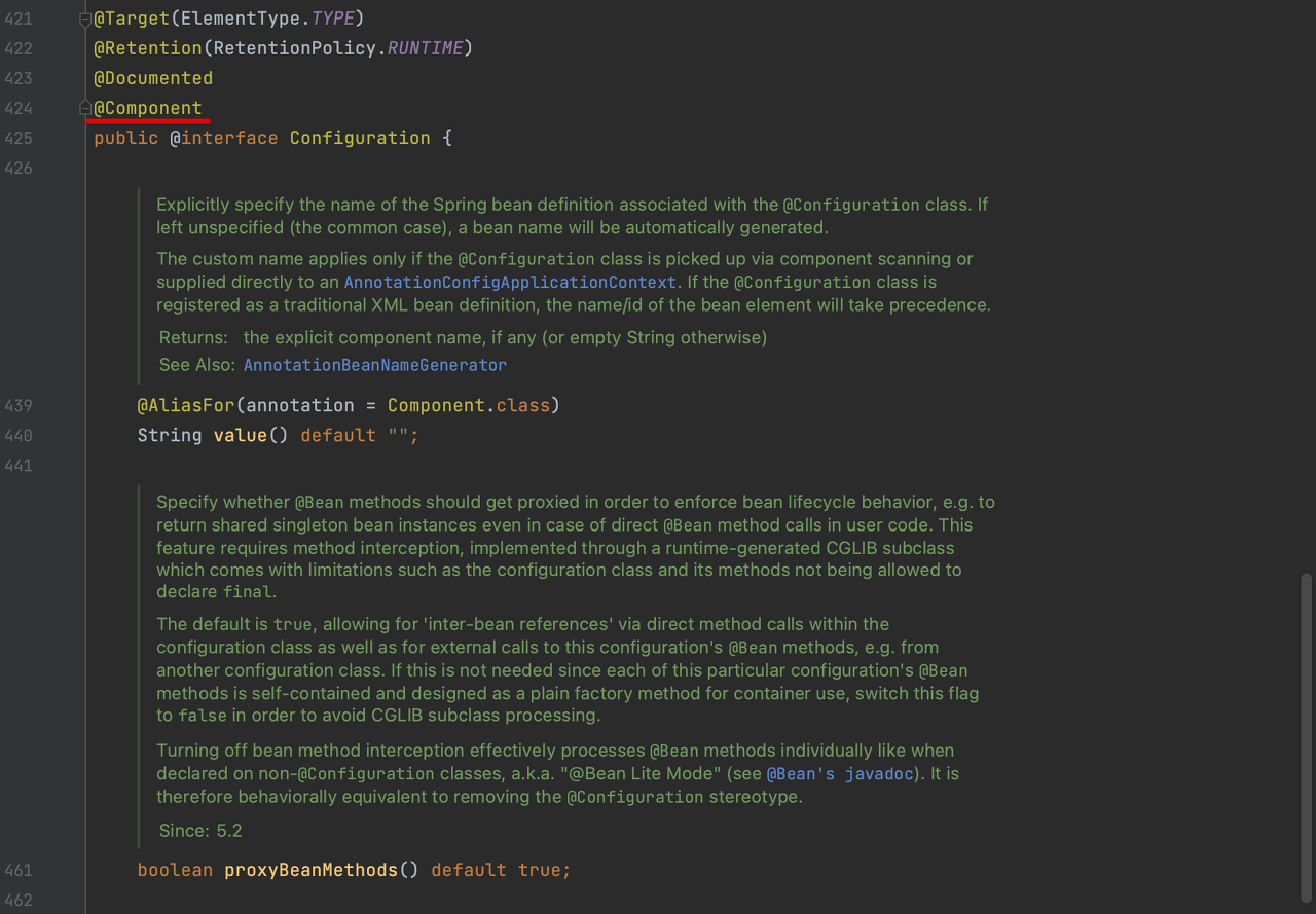 @Configuration의 내부를 살펴보면, @Component 설정이 되어 있는 것이 그 이유임을 알 수 있다.
