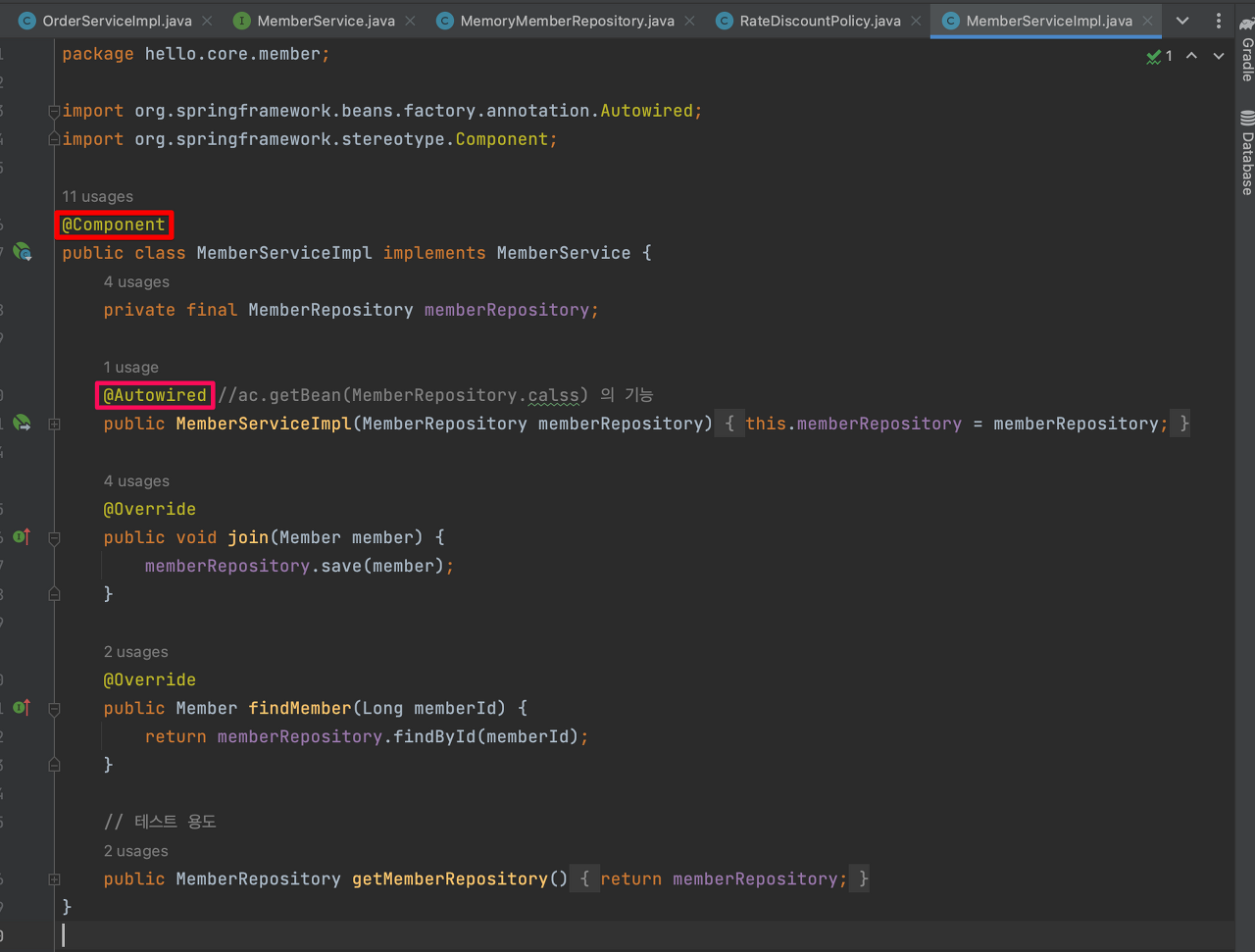 그래서 @Autowired를 사용한다. 생성자에 어노테이션만 붙이면 간단하게 의존관계를 주입해준다. 위와 같이 여러개의 객체도 모두 주입해준다.