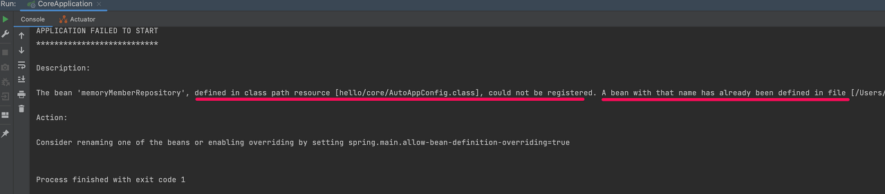 스프링 부트로 실행하여 수동 빈과 자동 빈을 충돌시킬 경우, 다음과 같이 오류가 발생한다.