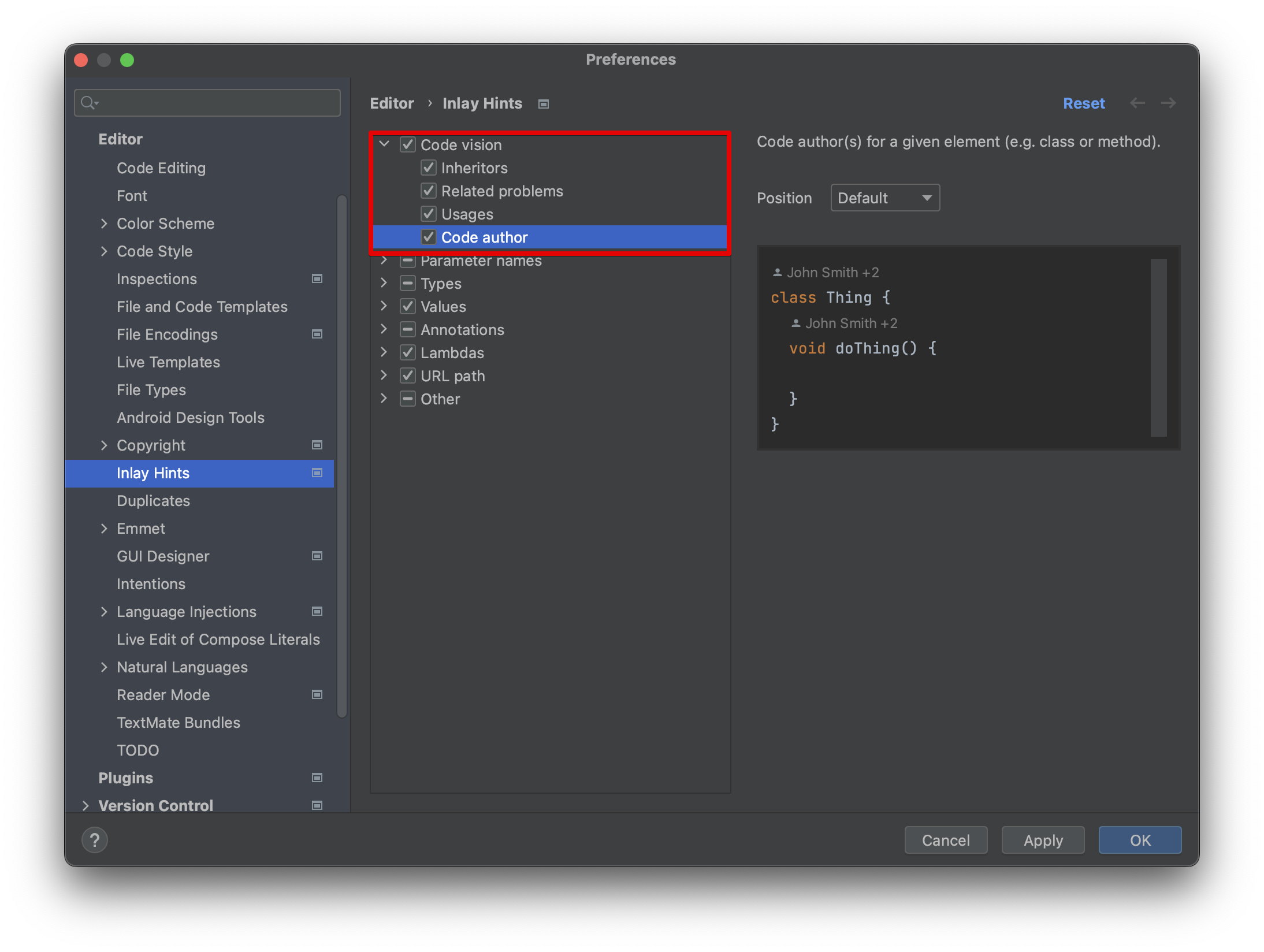 Inlay Hints - Code Vision에 필요한 항목만 체크하자.