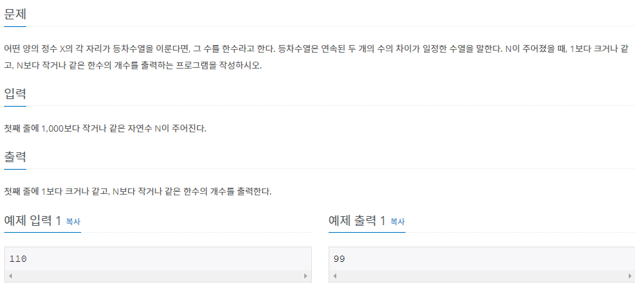어떤 양의 정수 X의 각 자리가 등차수열을 이룬다면, 그 수를 한수라고 한다. 등차수열은 연속된 두 개의 수의 차이가 일정한 수열을 말한다. N이 주어졌을 때, 1보다 크거나 같고, N보다 작거나