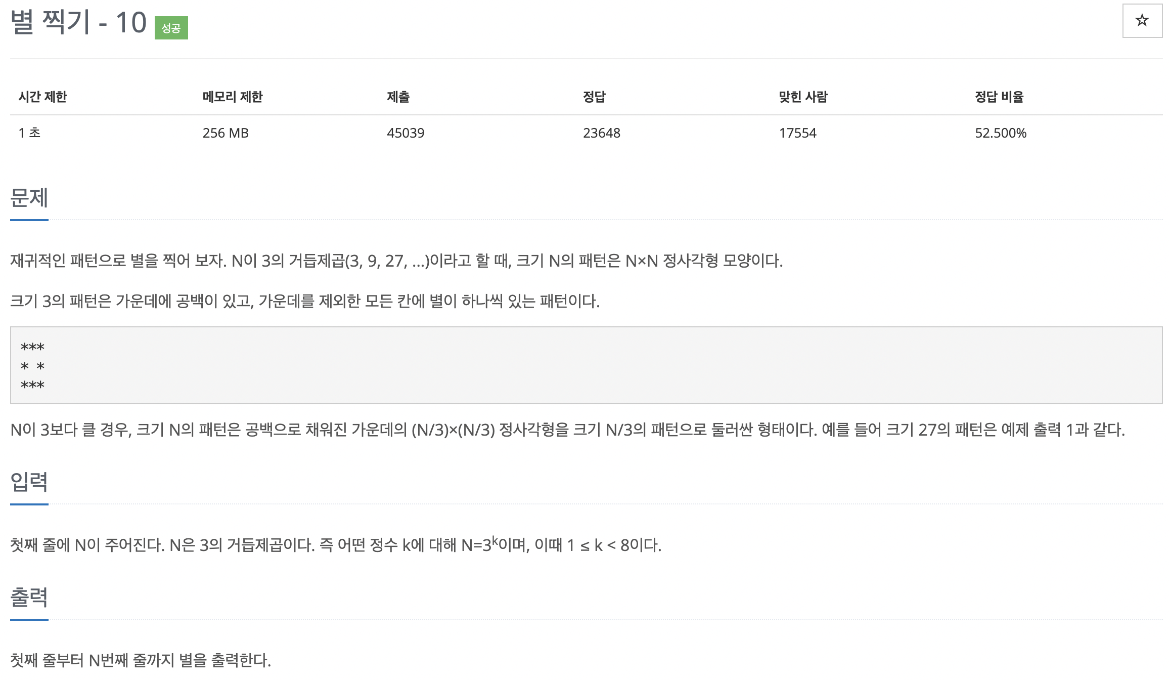 재귀적인 패턴으로 별을 찍어 보자. N이 3의 거듭제곱(3, 9, 27, ...)이라고 할 때, 크기 N의 패턴은 N×N 정사각형 모양이다. 크기 3의 패턴은 가운데에 공백이 있고, 가운데를 제외한 모든 칸에 별이