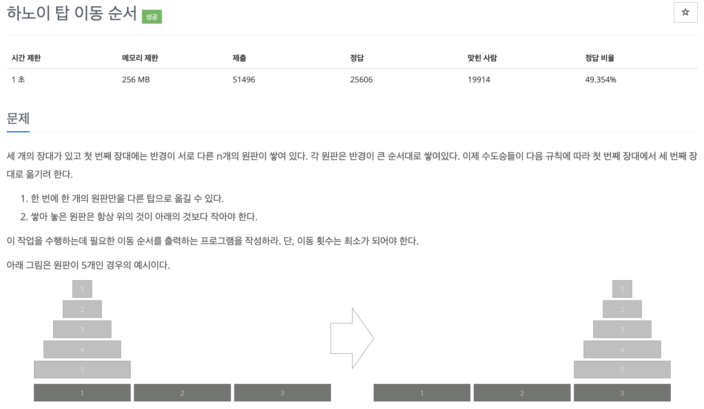 세 개의 장대가 있고 첫 번째 장대에는 반경이 서로 다른 n개의 원판이 쌓여 있다. 각 원판은 반경이 큰 순서대로 쌓여있다. 이제 수도승들이 다음 규칙에 따라 첫 번째 장대에서 세 번째 장대로