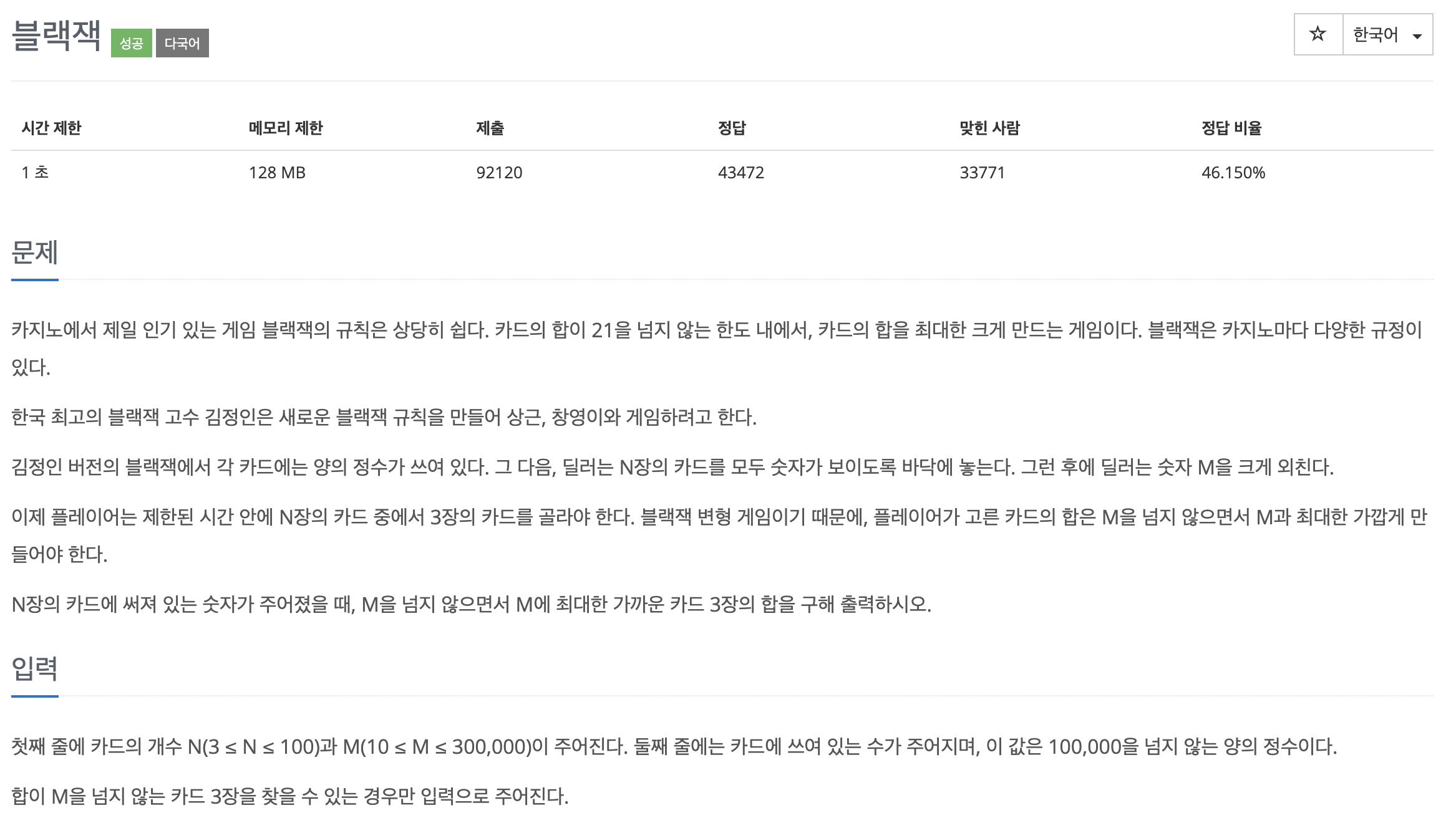 첫째 줄에 카드의 개수 N(3 ≤ N ≤ 100)과 M(10 ≤ M ≤ 300,000)이 주어진다. 둘째 줄에는 카드에 쓰여 있는 수가 주어지며, 이 값은 100,000을 넘지 않는 양의 정수이다. 합이 M을 넘지 않는 카드 3장